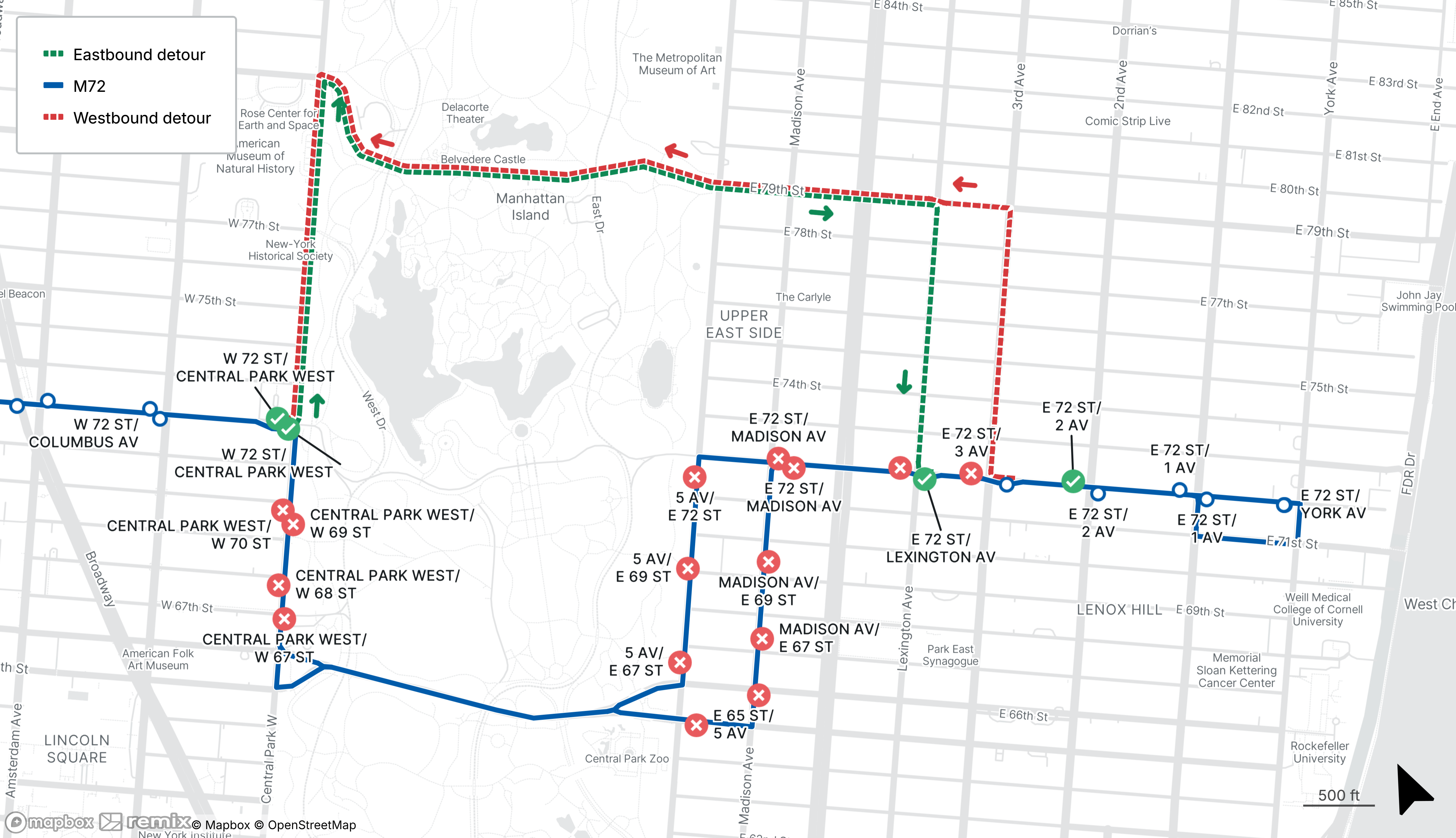 M72 buses will be detoured from 72nd St between 3rd Ave and Central Park West in both directions
