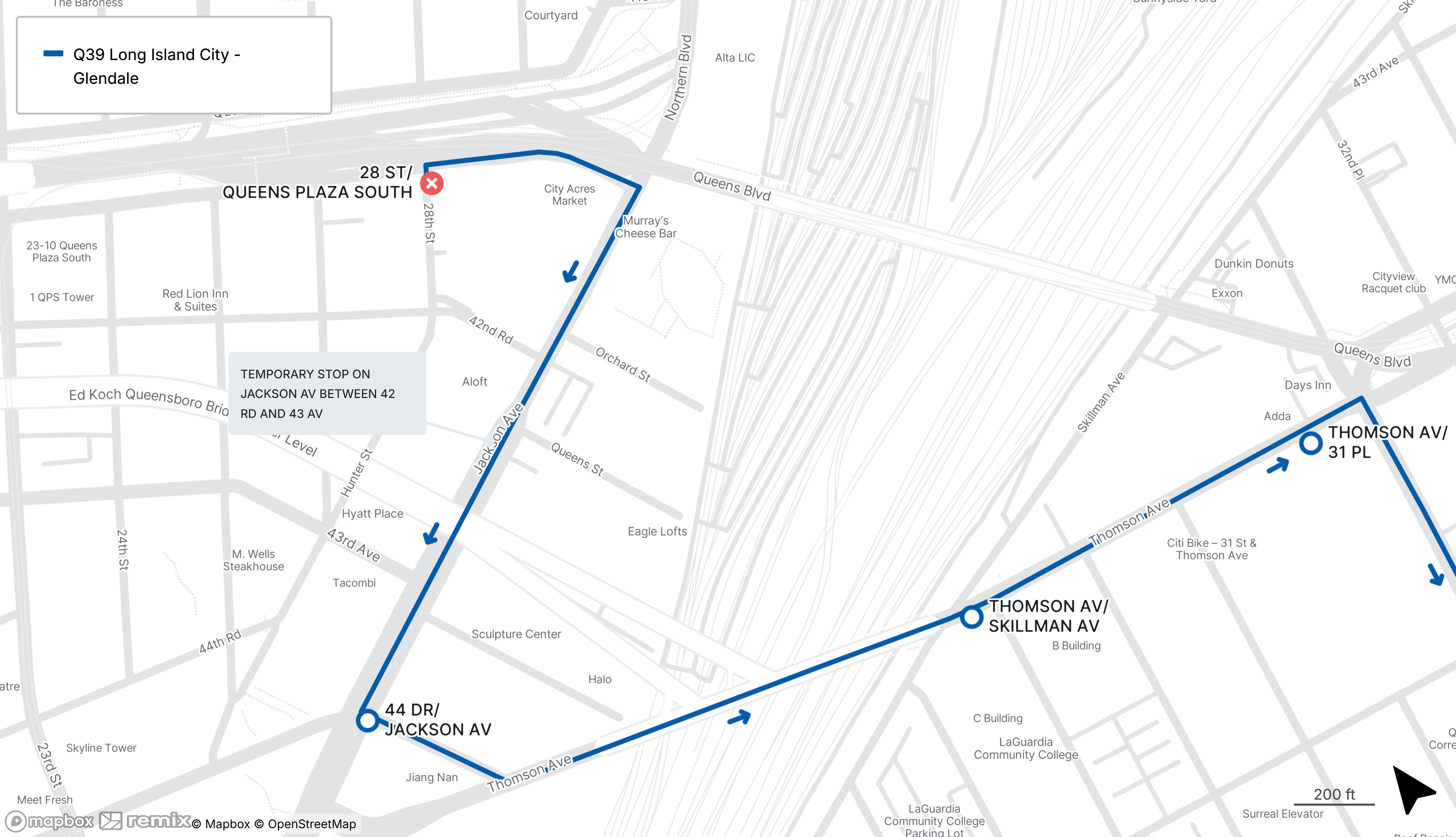 Eastbound Q39stop on 28th St at Queens Plaza South will be closed, use the temporary stop on Jackson Ave between 42nd Rd and 43rd Ave