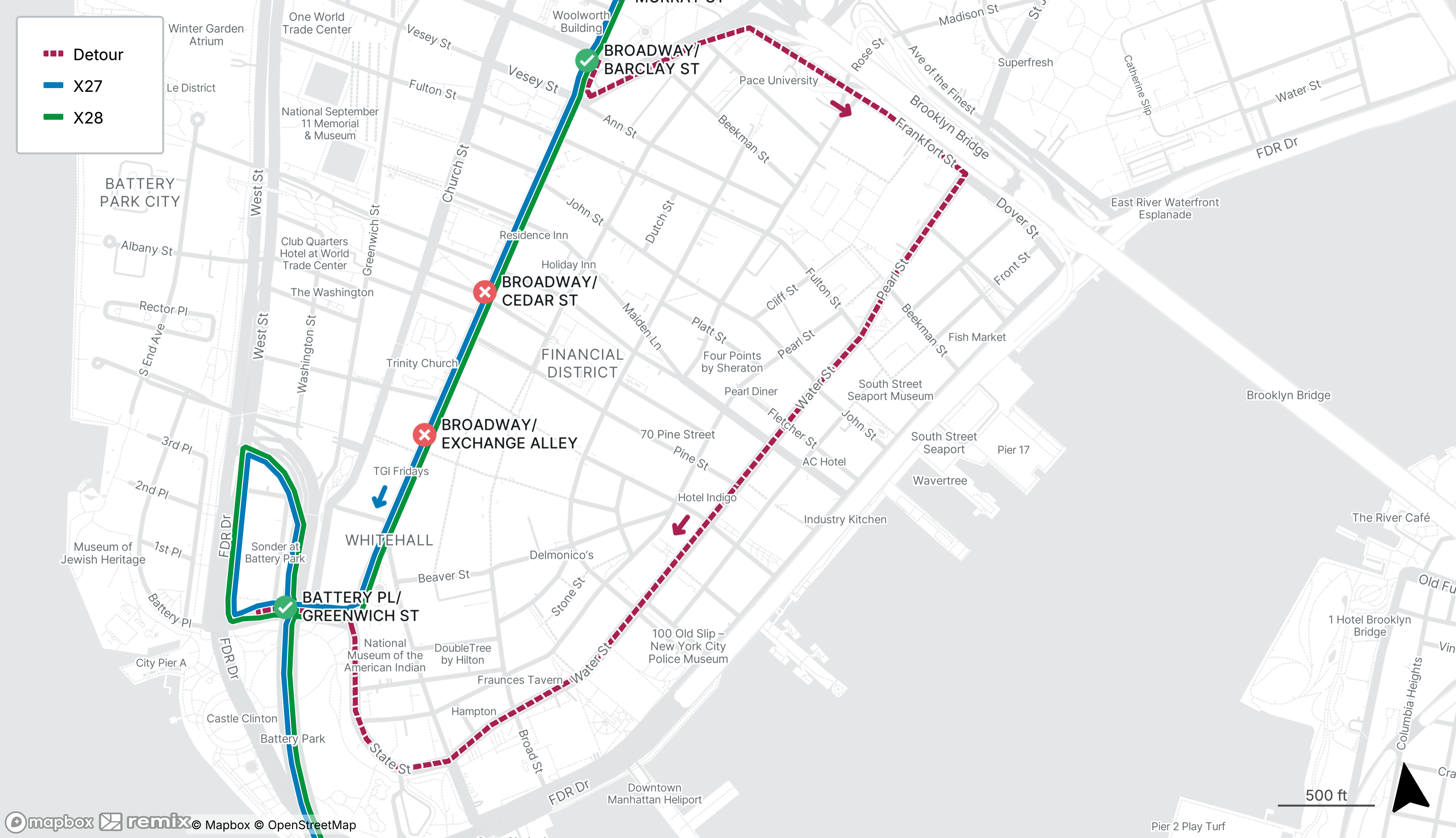 Southbound X27 and X28 stops on Broadway at Cedar St and Exchange Alley will be closed