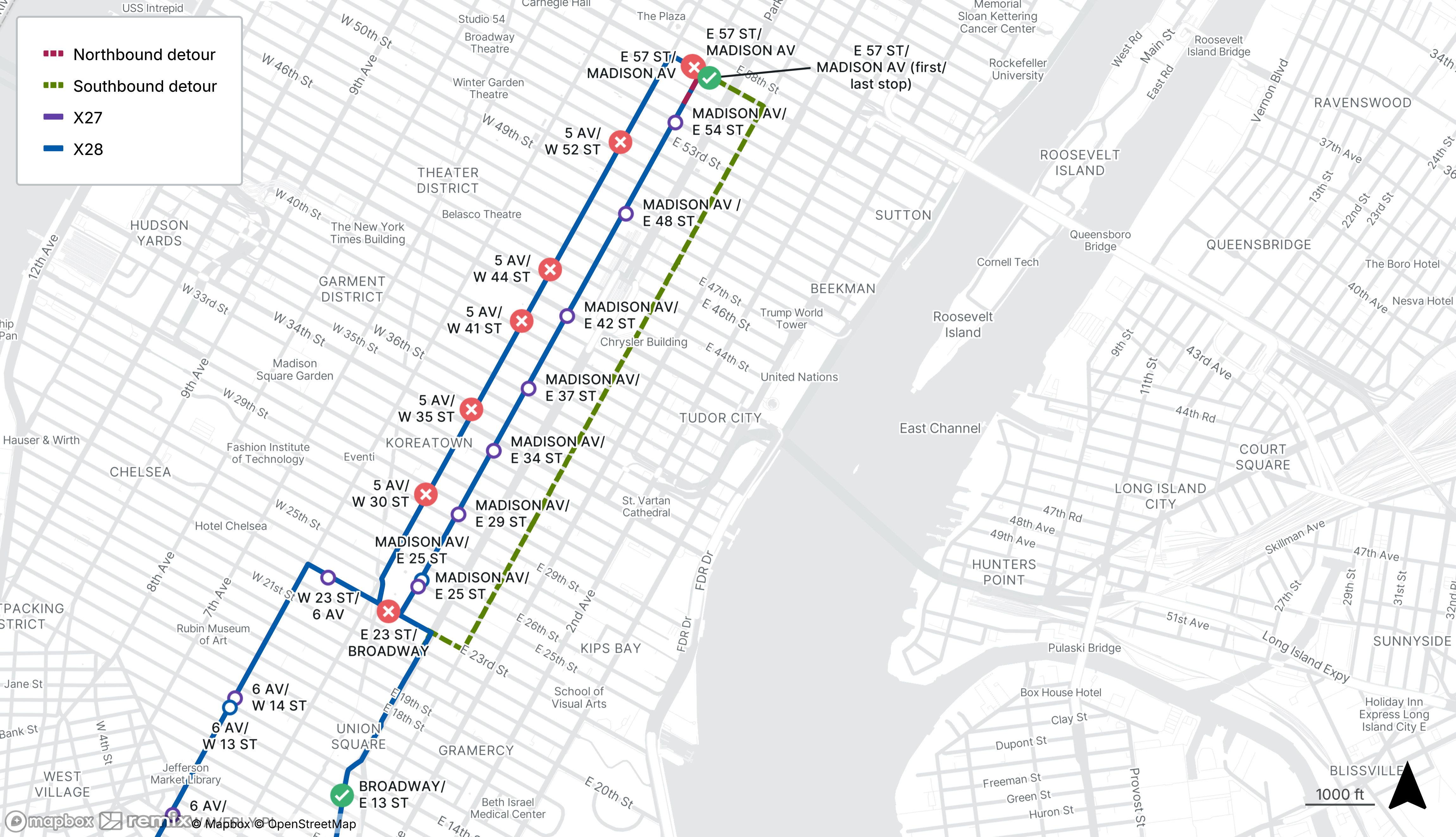 X27 and X28 stops on E 57th St at Madison Ave and southbound stops on 5th Ave from W 52nd St to W 30th St and on E 23rd St at Broadway will be closed