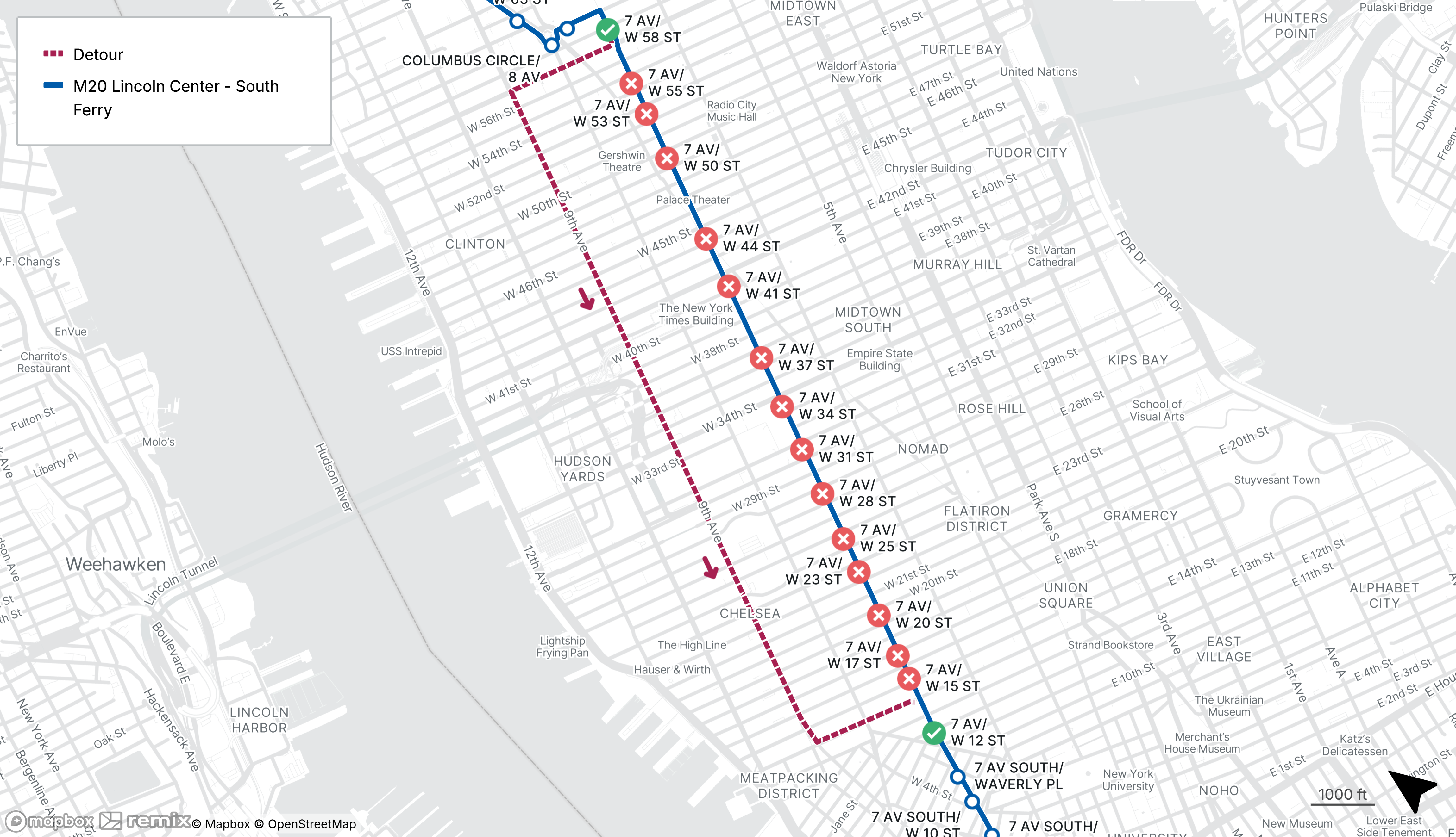 Southbound M20 stops on 7th Ave from W 55th St to W 15th St will be closed