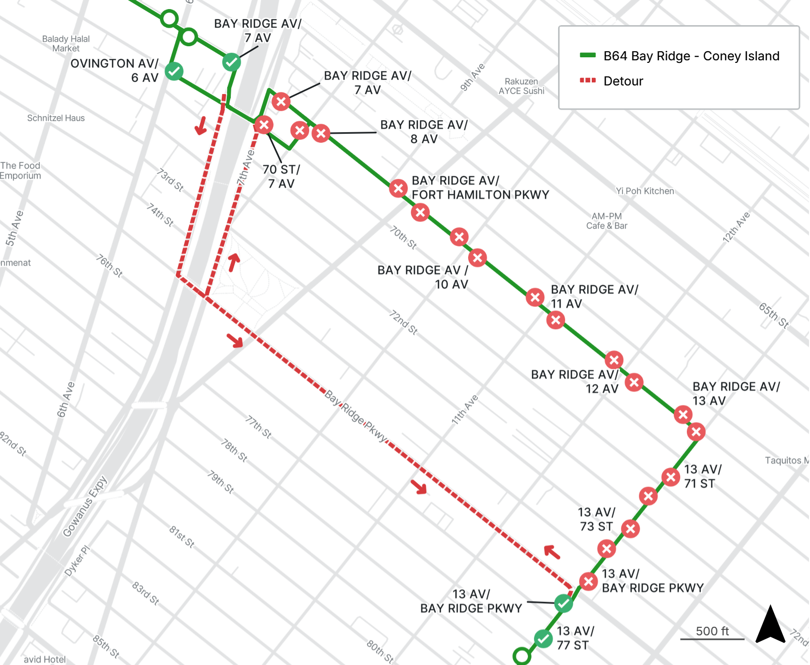 B64 buses are detoured in both directions between 13th Ave at Bay Ridge Pkwy and the Gowanus Expwy