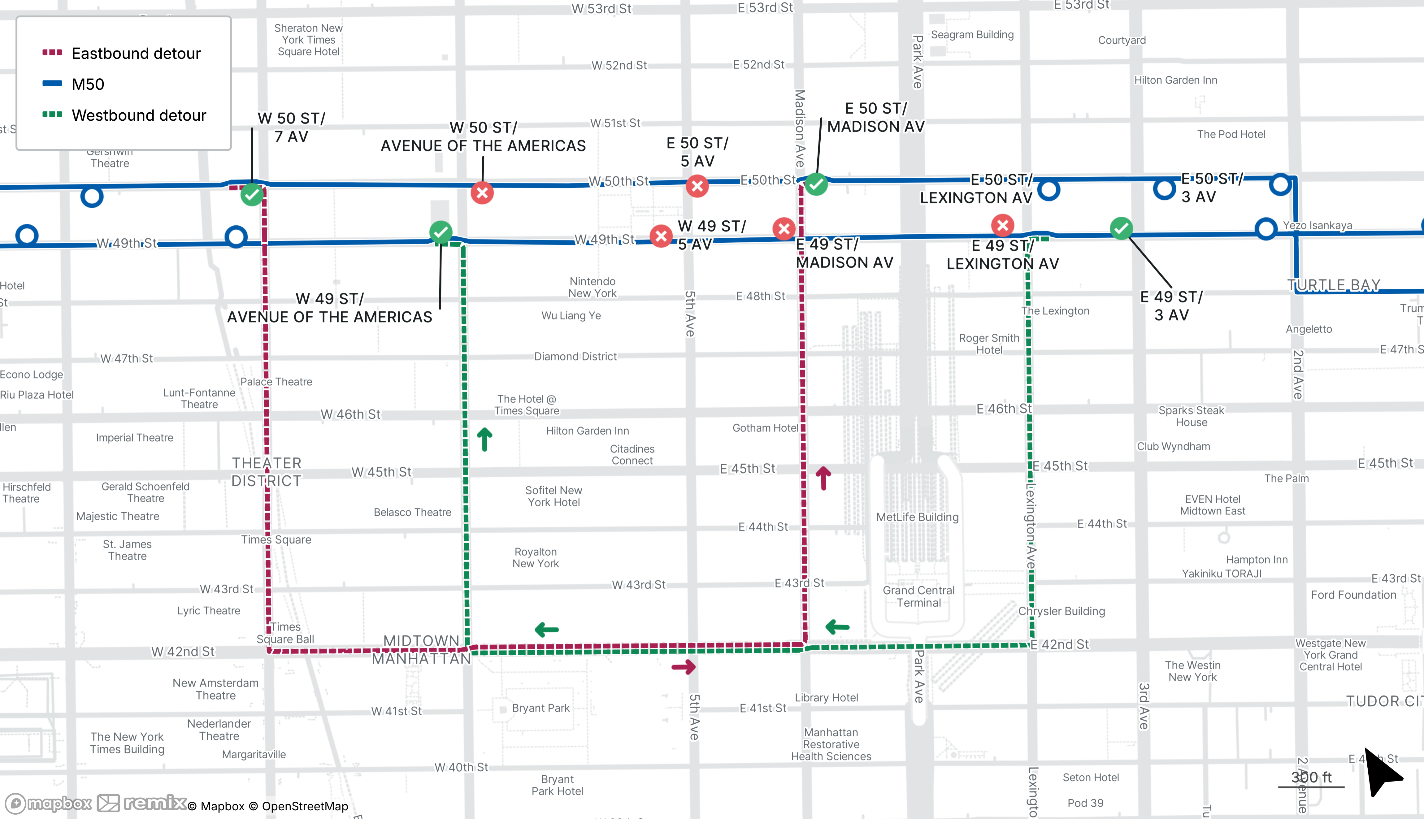 M50 buses will be detoured from 49th St/50th St between Lexington Ave and 7th Ave