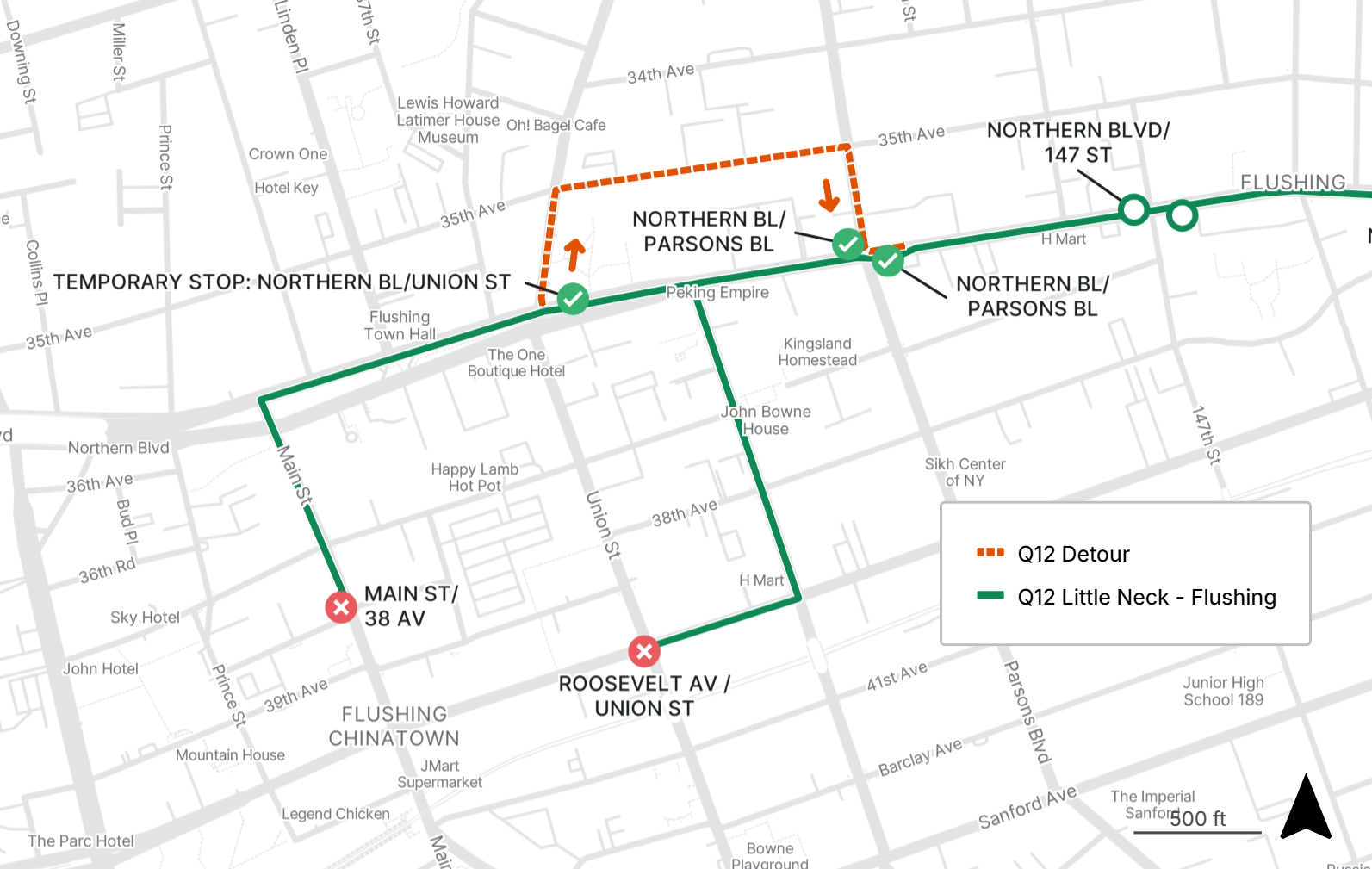 Buses detour via Union St, 35th Ave and Parsons Blvd.