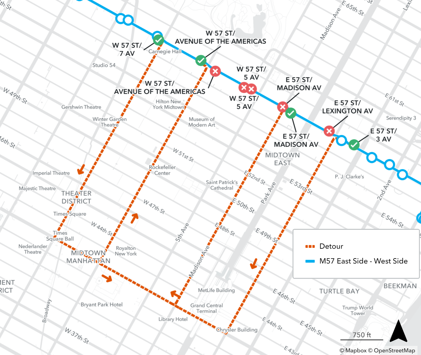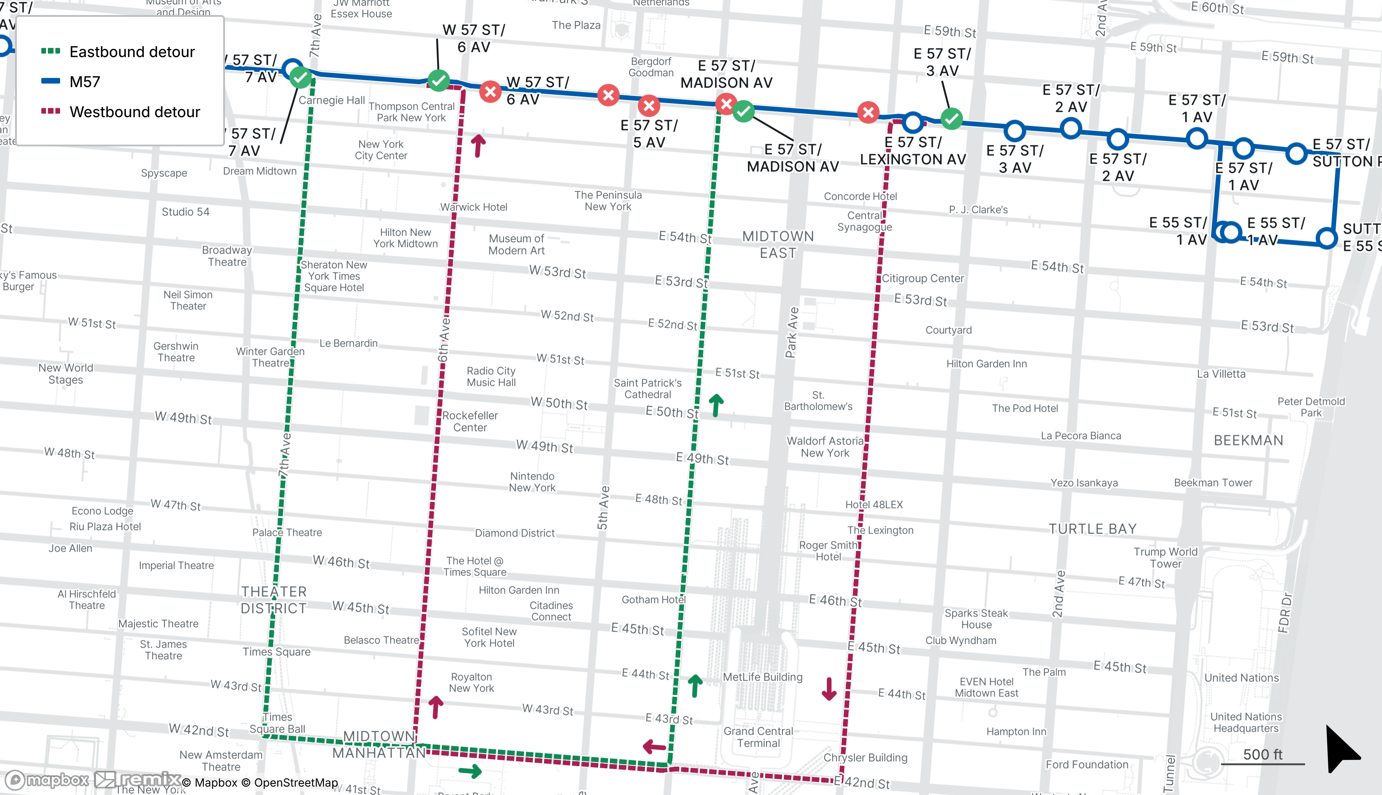 M57 eastbound stops on W 57th St at 6th Ave and 5th Ave and westbound stops along 57th St from Lexington Ave to 5th Ave are closed