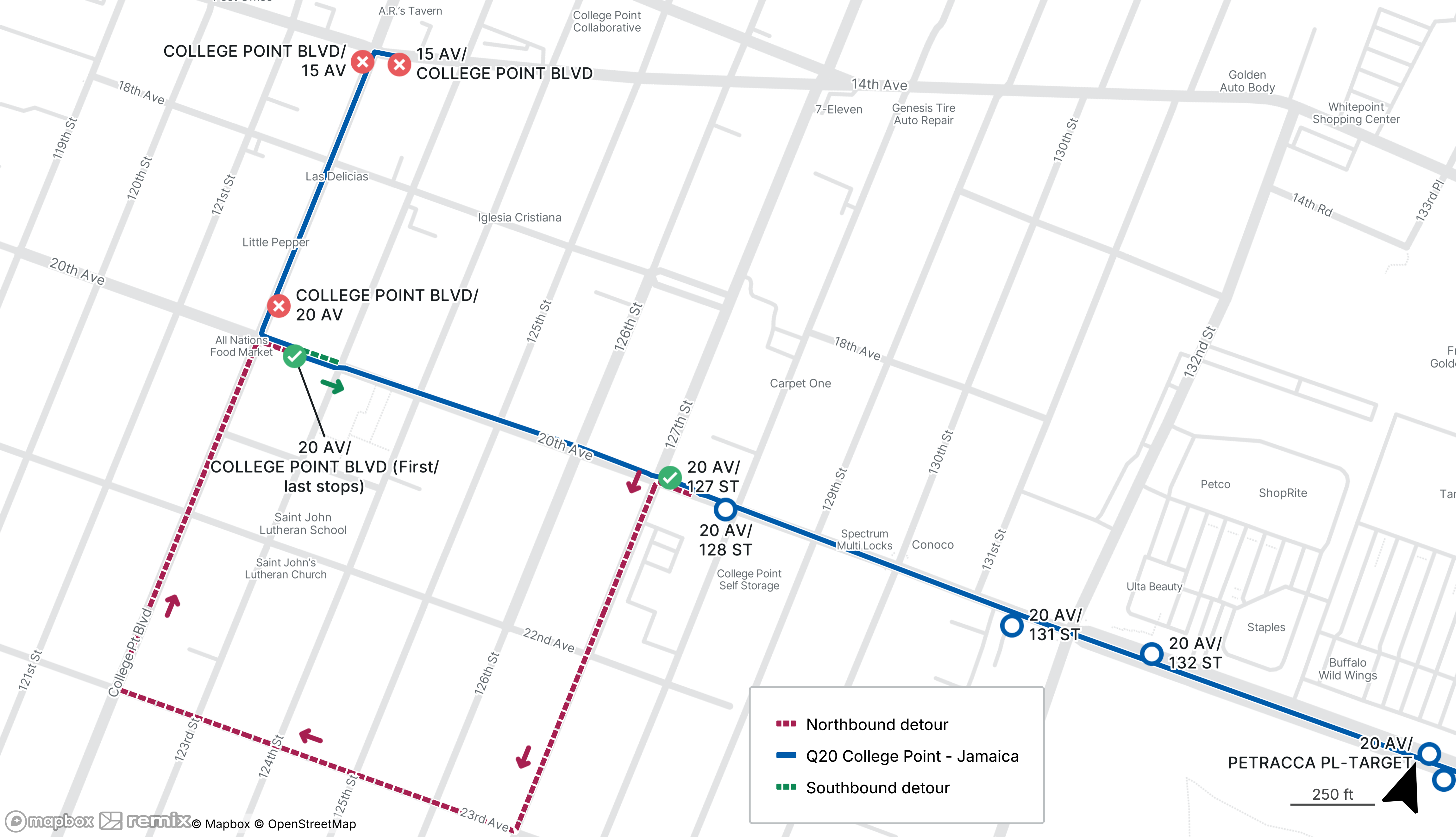 No Q20 service between 15th Ave at College Point Blvd and 20th Ave at College Point Blvd