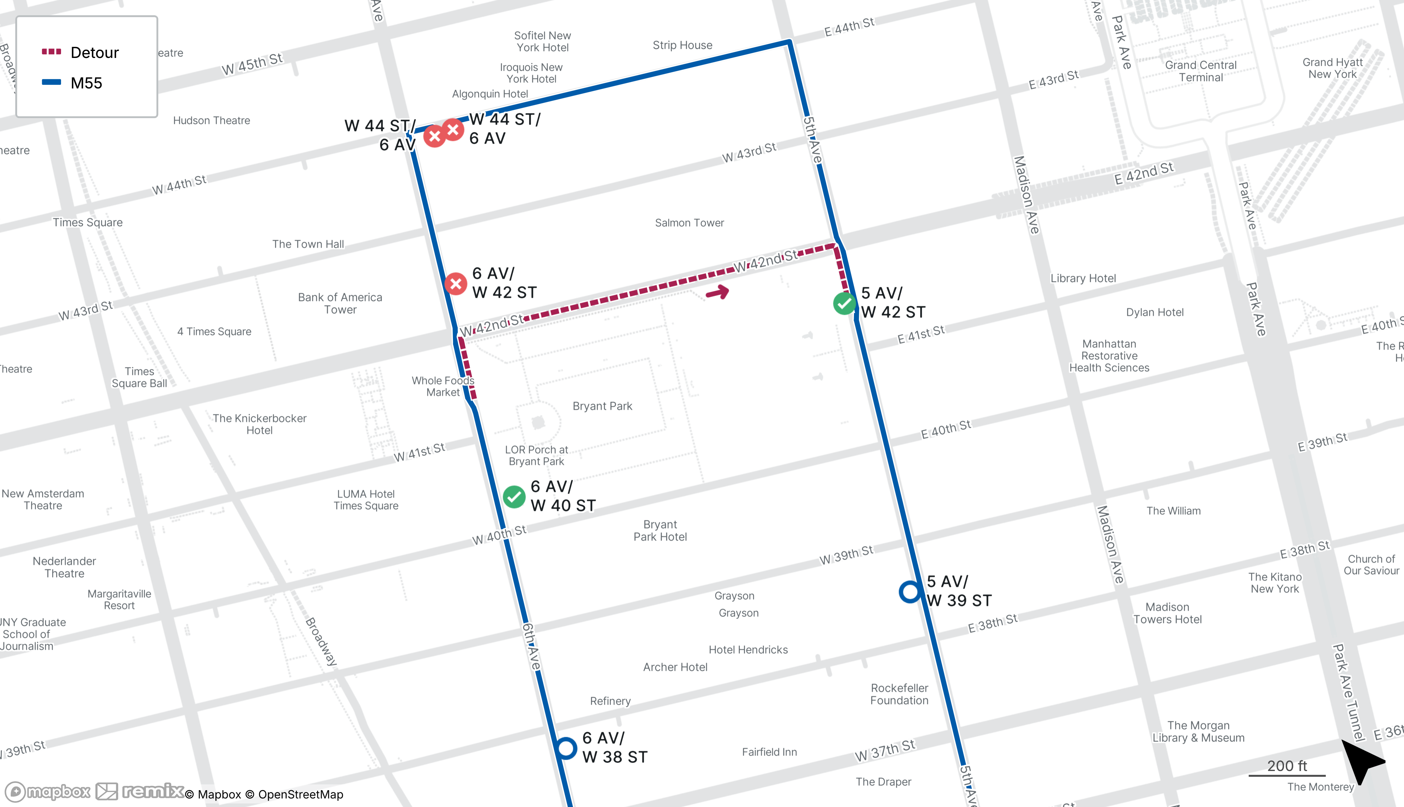 Northbound M55 stop along 6th Ave at W 42nd St and the stops on W 44th St at 6th Ave in both directions will be closed