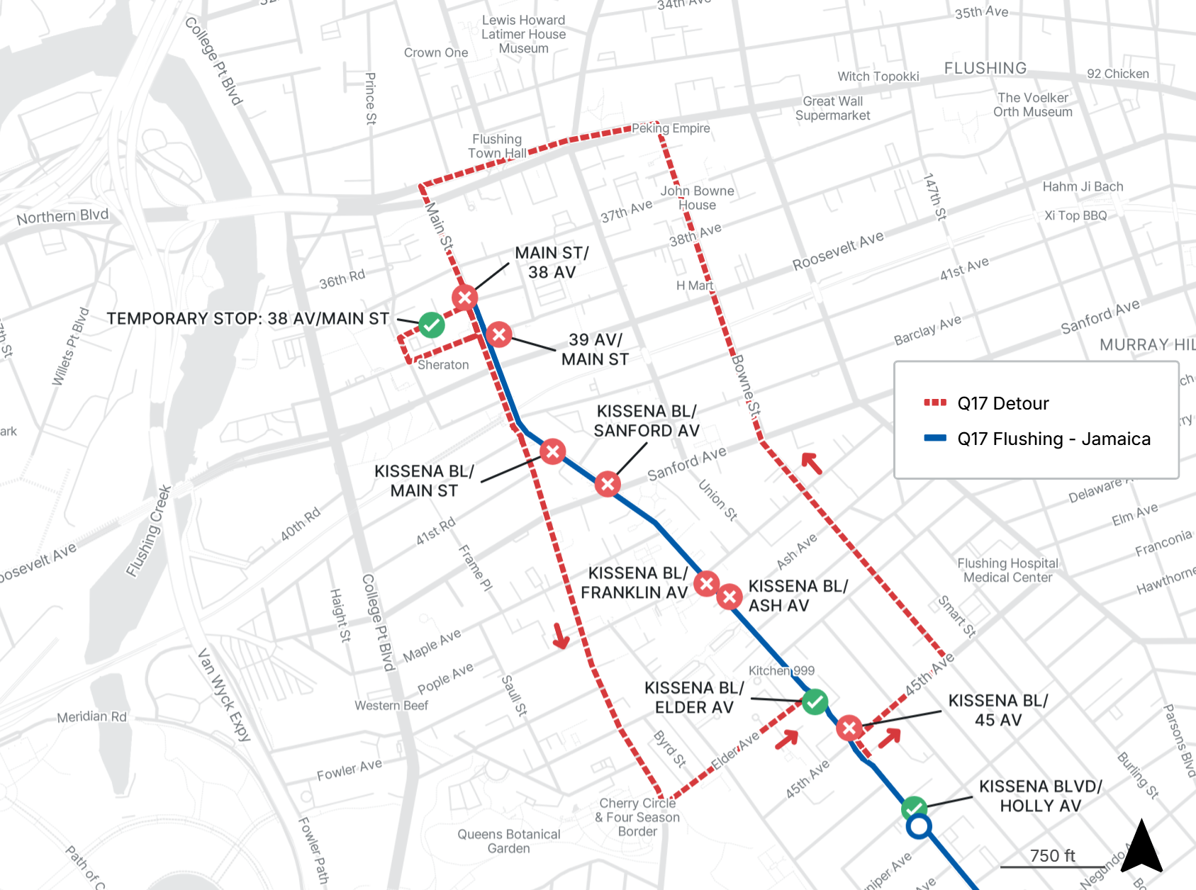 Q17 buses are detoured in both directions between Kissena Blvd at 45th Ave and Main St at 38th Ave
