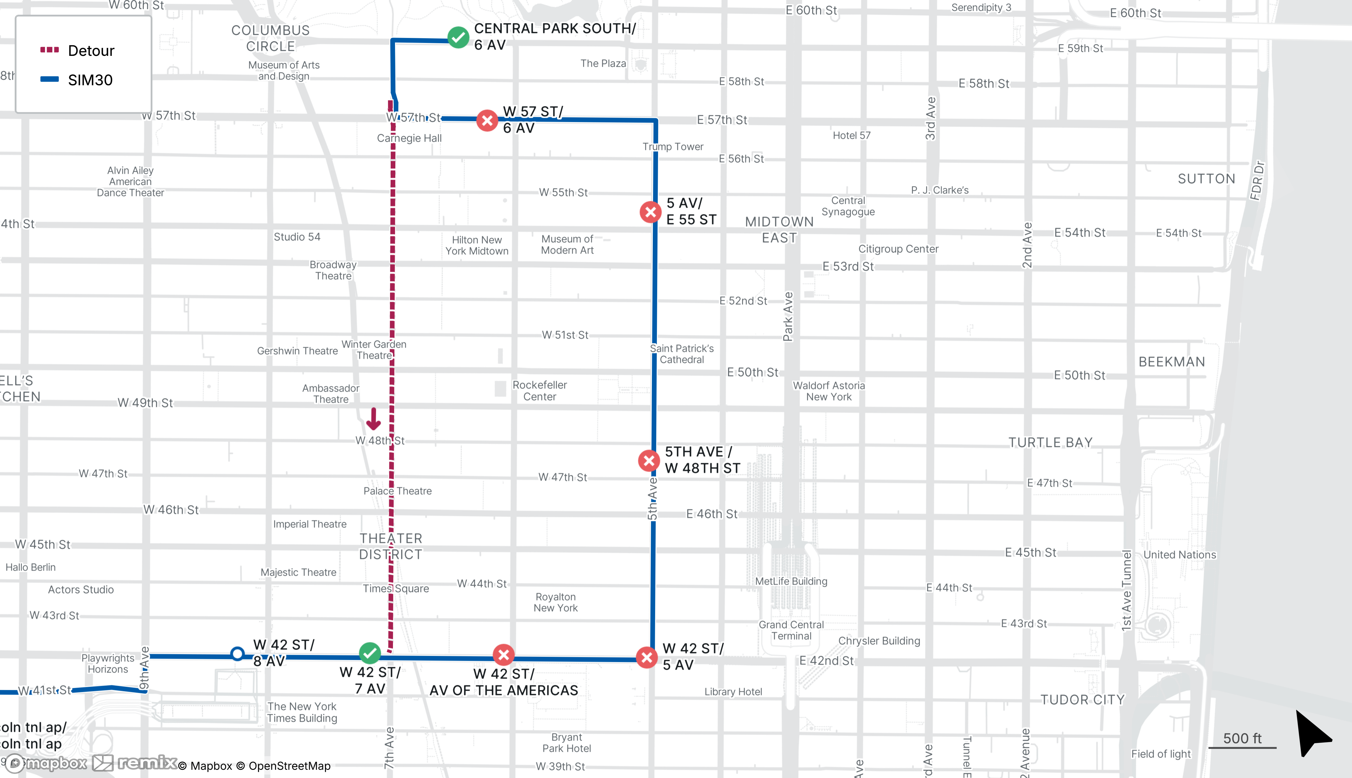 Southbound SIM30 stops on W 57th St at 6th Ave, all stops on 5th Ave and on W 42 St at 5th Ave and 6th Ave will be closed