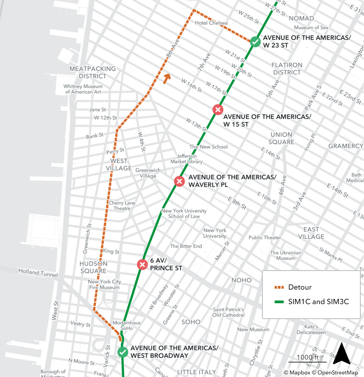 Northbound SIM1C and SIM3C stops along 6th Ave from Prince St to W 15th St are closed