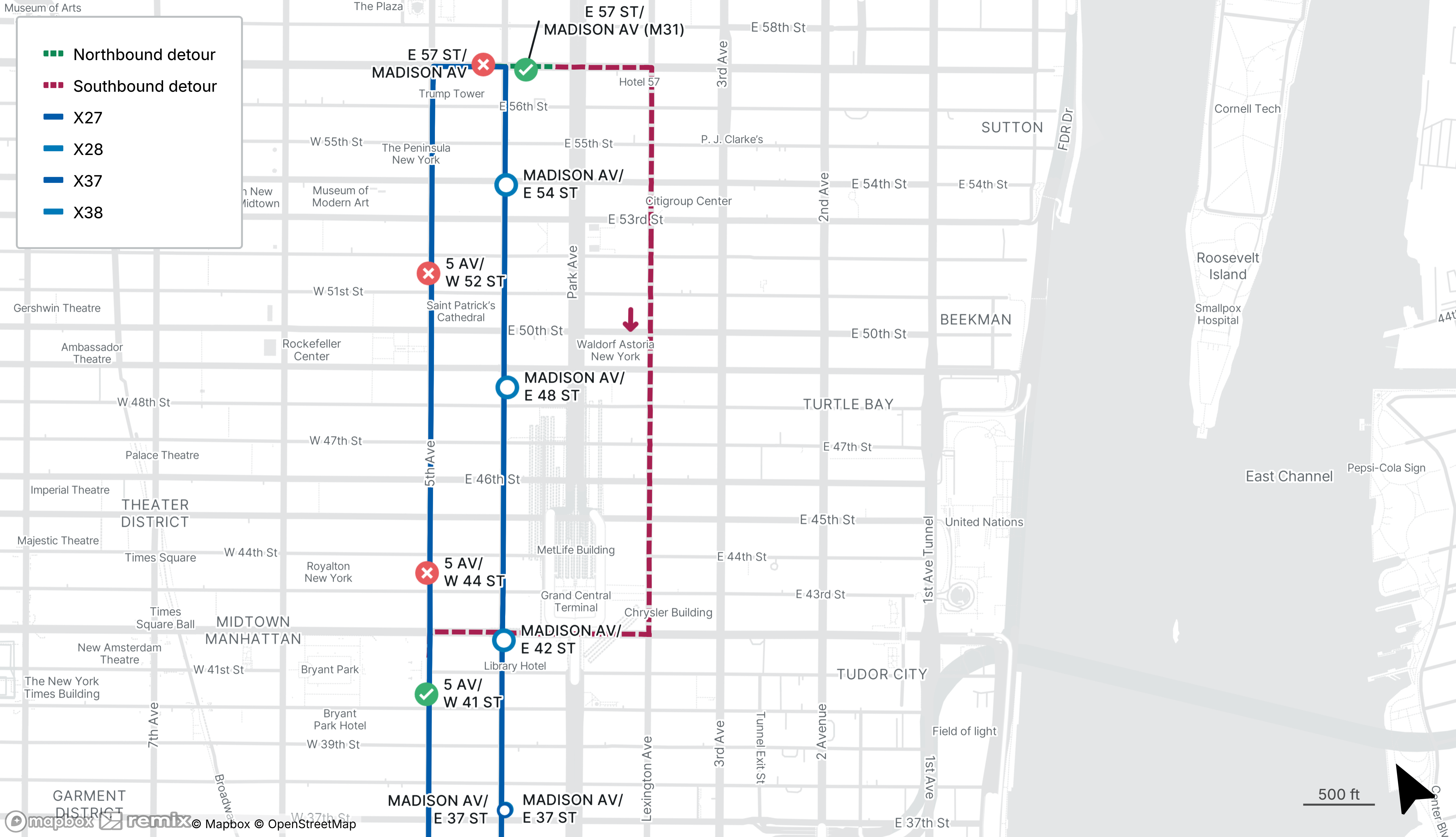 Southbound X27, X28, X37 and X38 stops along 5th Ave from W 52nd St to W 44th St and the stops on E 57th St at Madison Ave will be closed