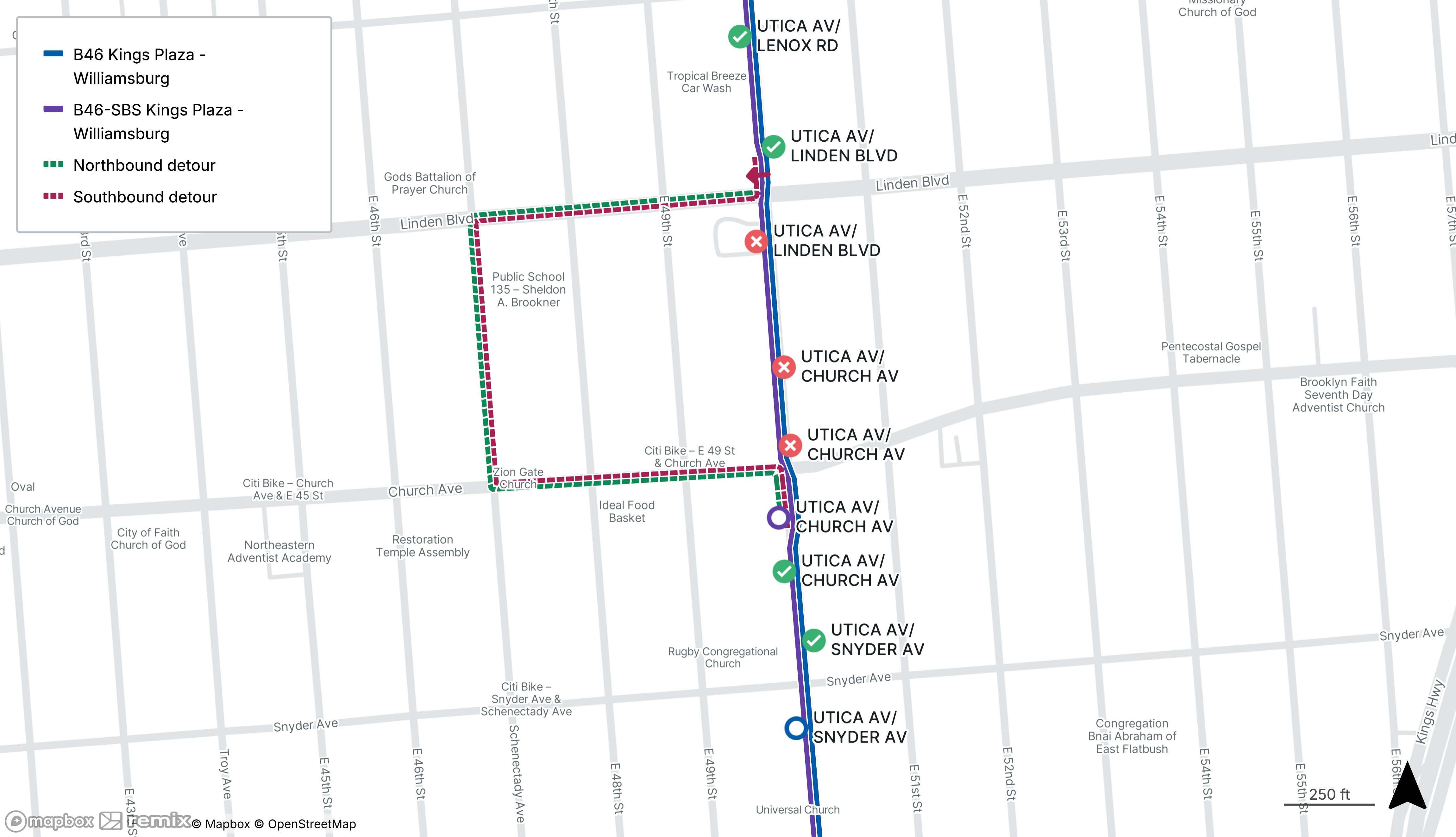 B46 and B46-SBS buses will be detoured from Utica Ave between Linden Blvd and Church Ave