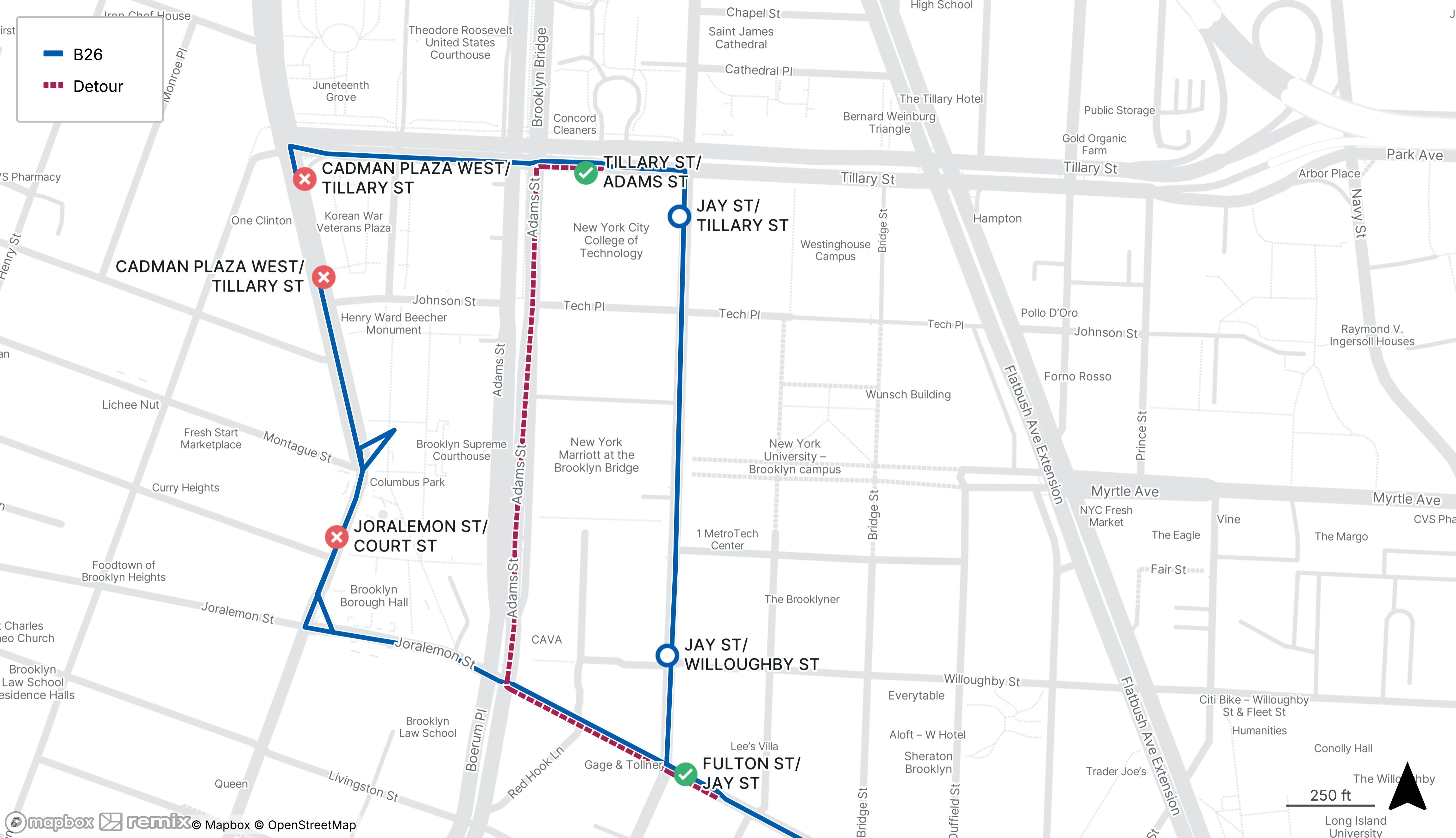 B26 westbound stop on Joralemon St at Court St and Cadman Plaza at Tillary St in both directions will be closed