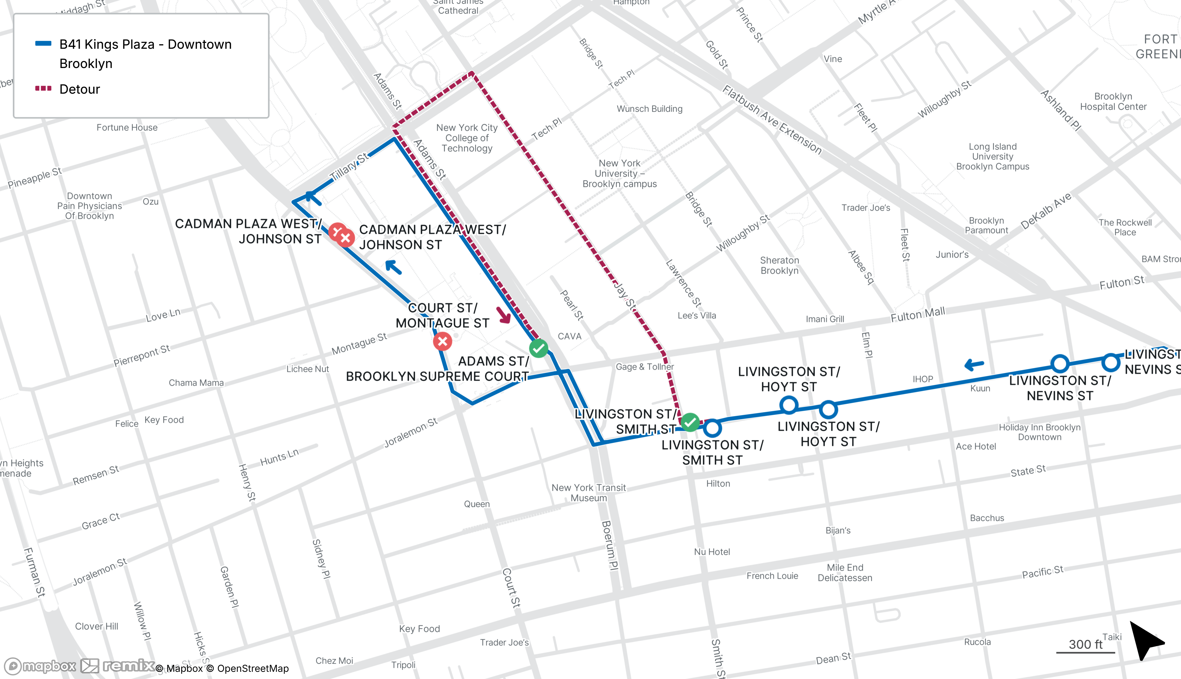 B41 buses will be detoured between Livingston St at Smith St and Adams St at Brooklyn Supreme Court
