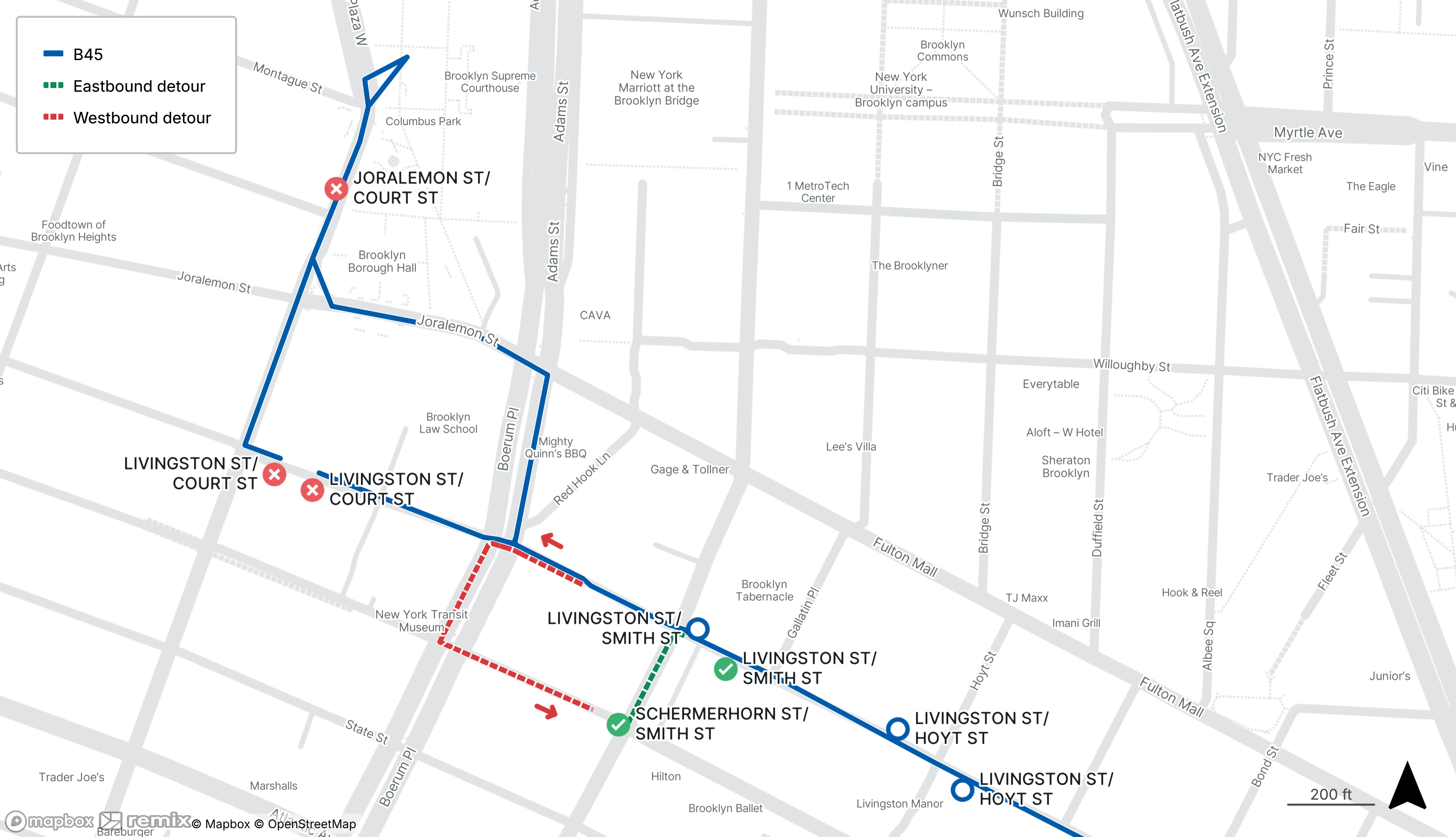 B45 westbound stop on Joralemon St at Court St and Livingston St at Court St stops in both directions will be closed