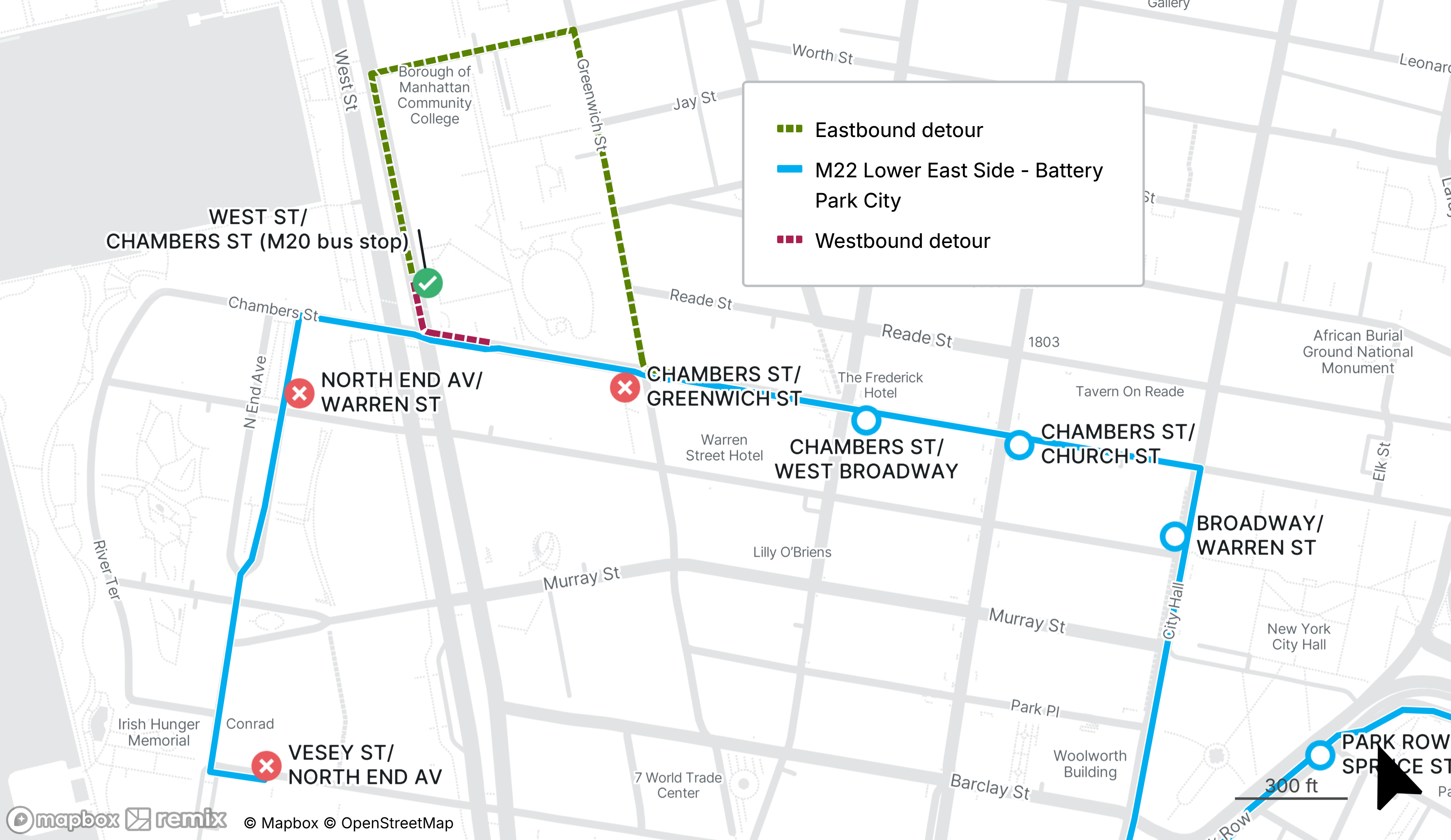 No M22 service between Vesey St at North End Ave and Chambers St at West St