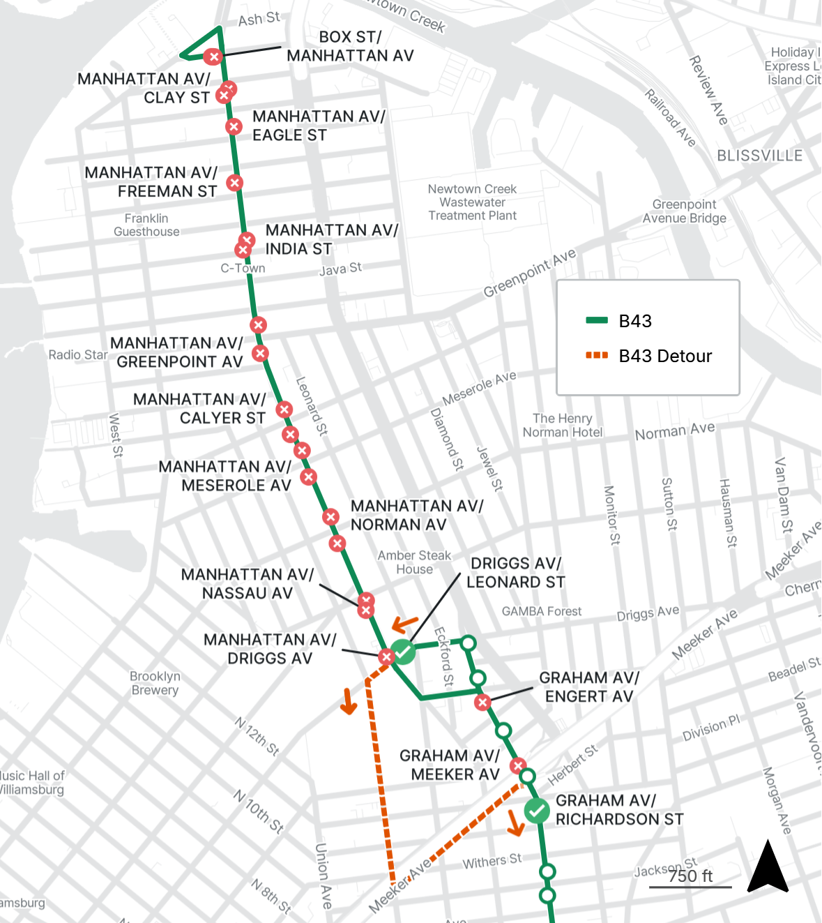 B43 stops on Graham Ave at Scholes St and the southbound stop on Graham Ave at Grand St will be closed