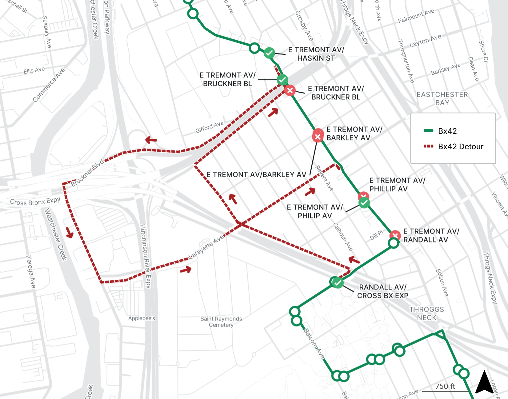Bx42 buses are detoured from E Tremont Ave between Bruckner Blvd and the Cross Bronx Expwy Service Rd in both directions