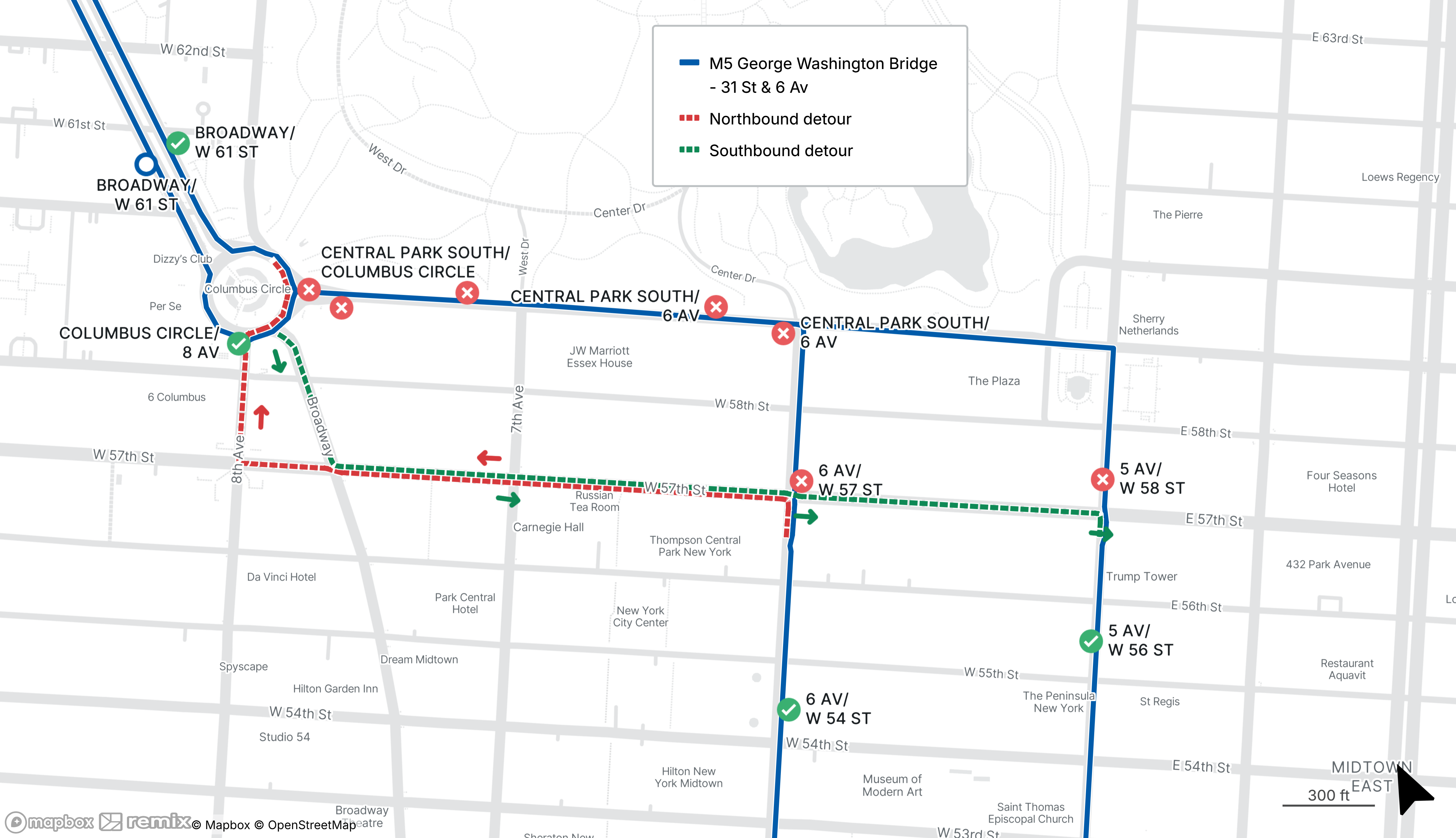 M5 buses will be detoured between 6th Ave at W 57th St and 8th Ave at Columbus Circle