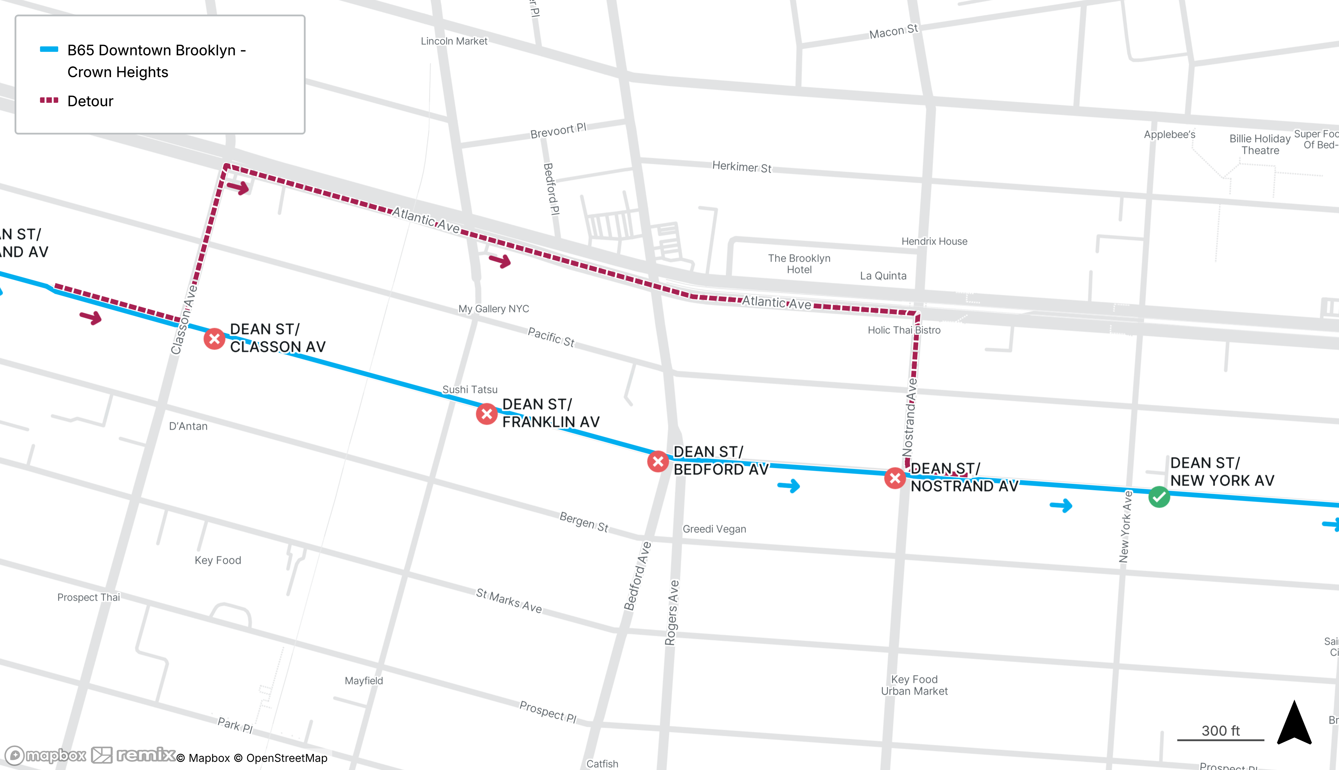 Eastbound B65 stops on Dean St from Classon Ave to Nostrand Ave will be closed