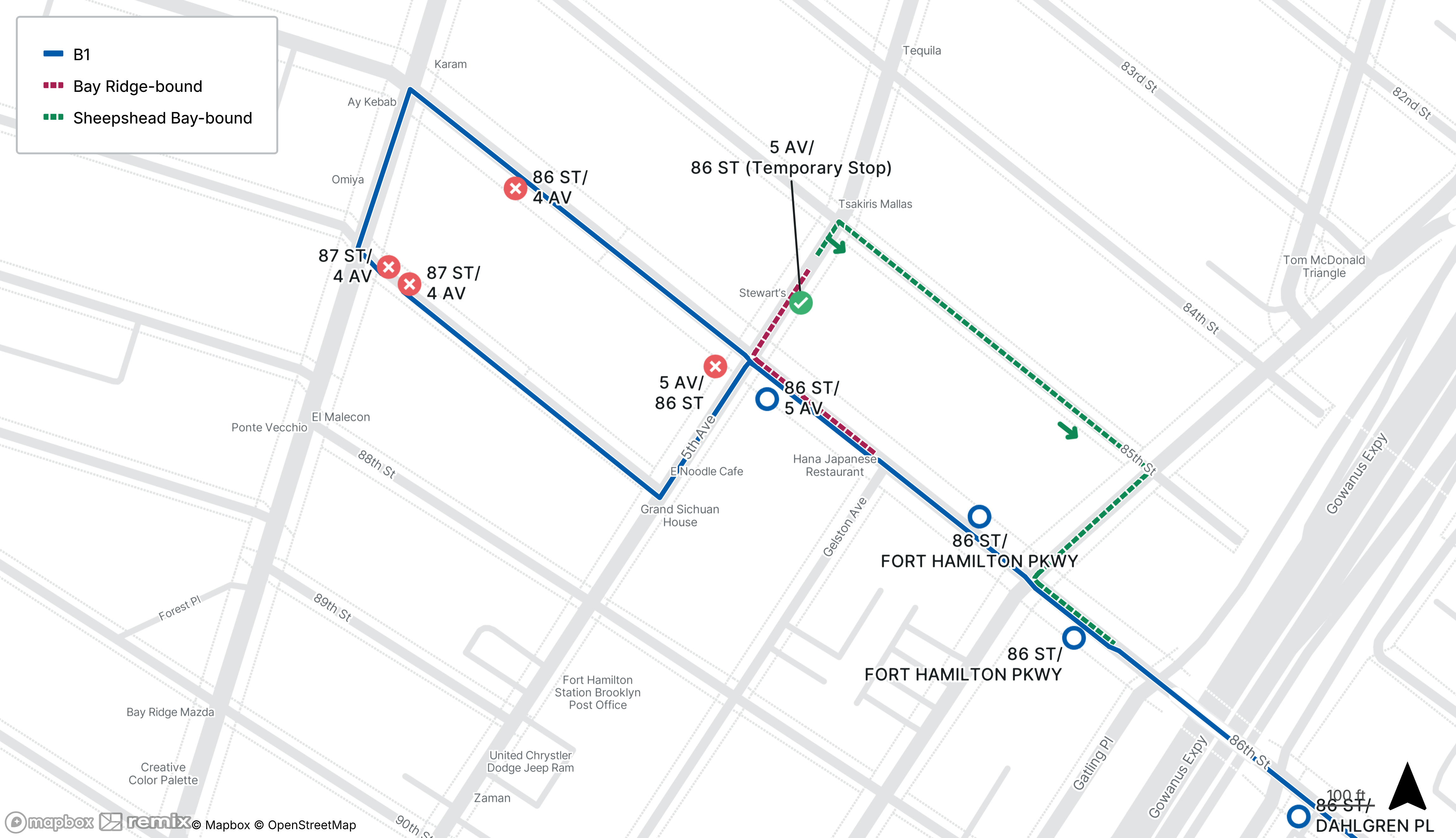 No B1 service between 87th St at 4th Ave and 5th Ave at 86th St