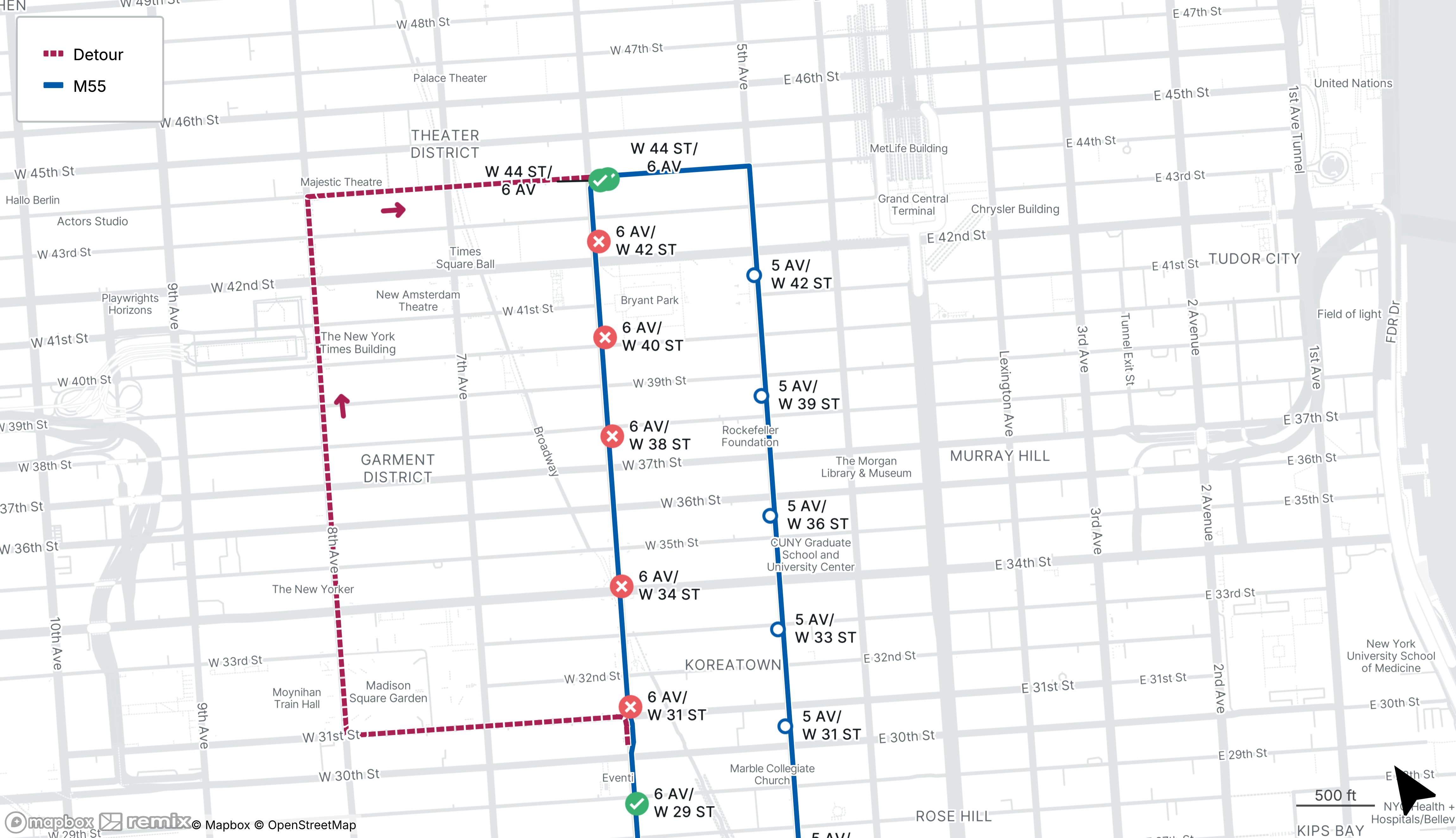 No M55 service from 6th Ave between W 31st St and W 42nd St