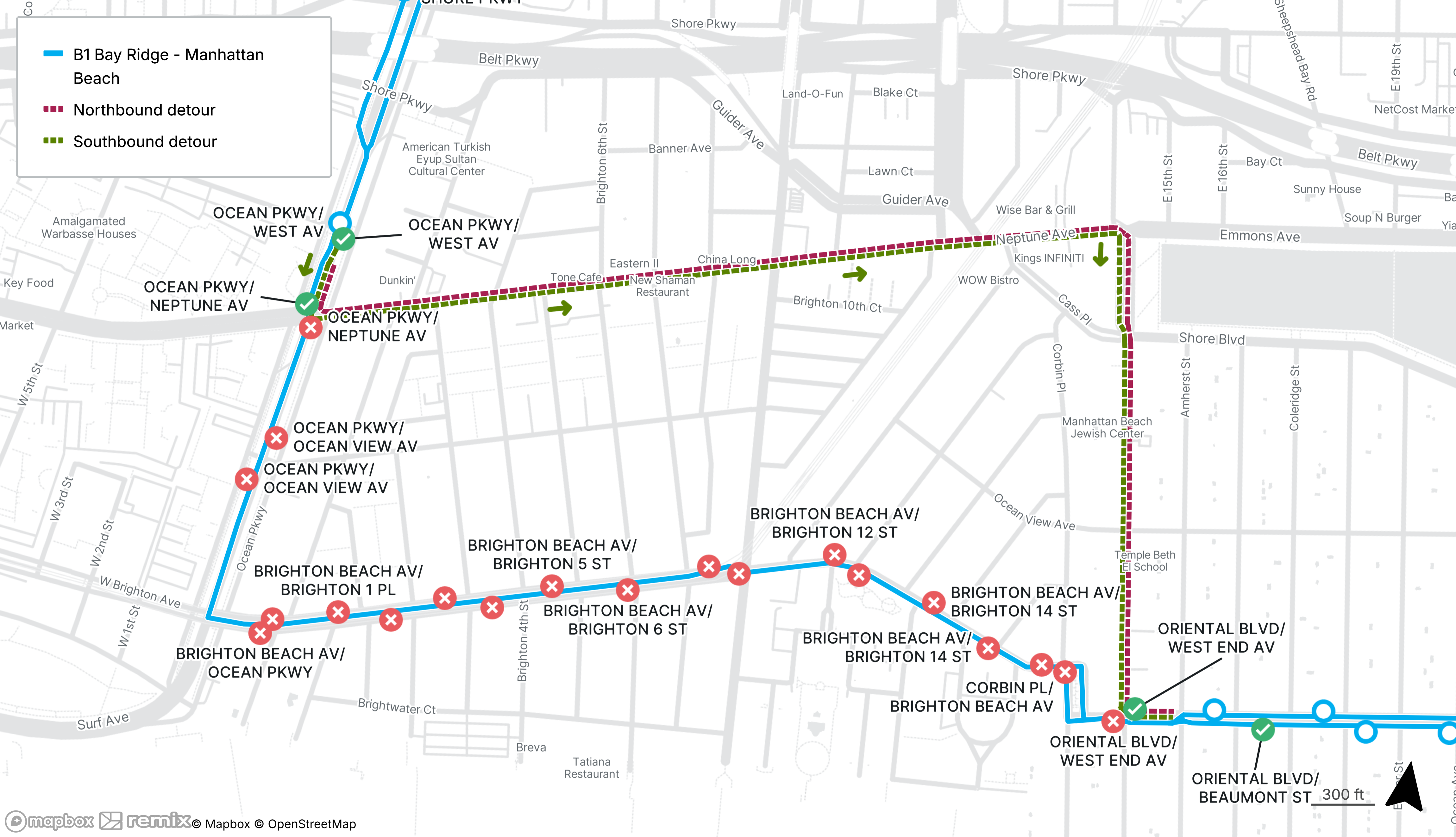 B1 buses will be detoured between Ocean Parkway at Neptune Ave and Oriental Blvd at West End Ave