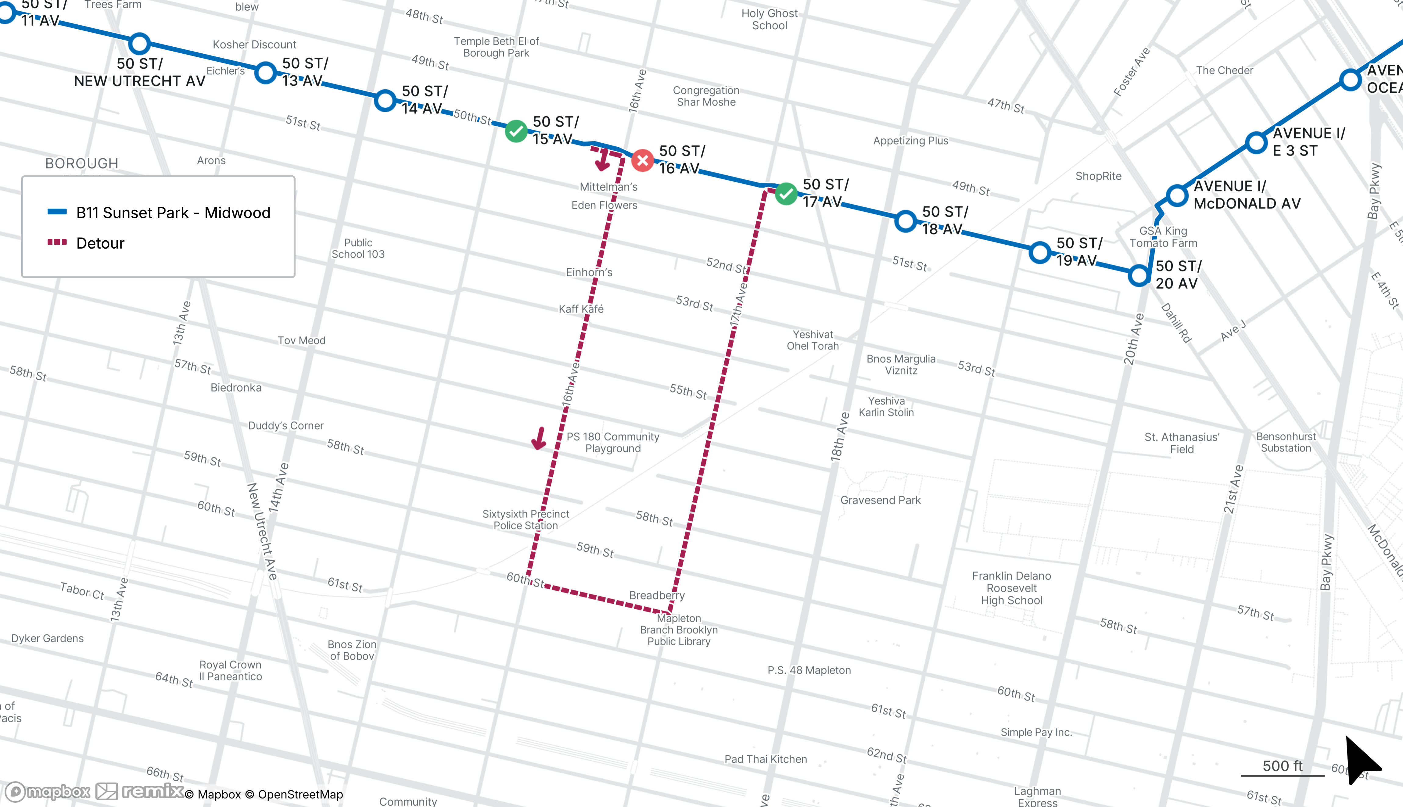 Eastbound B11 stop on 50th St at 16th Ave will be closed