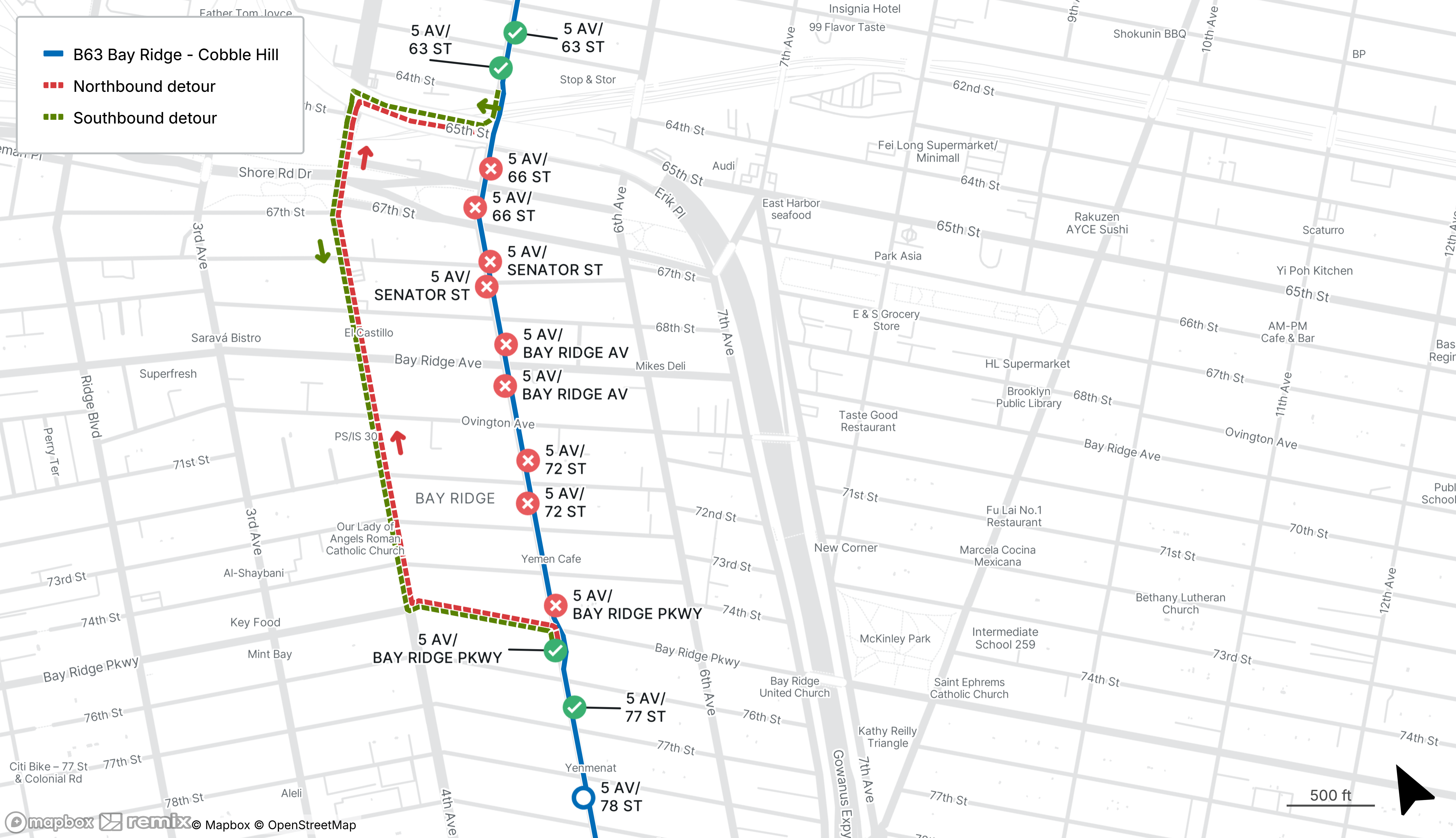 B63 buses will be detoured from 5th Ave between 65th St and Bay Ridge Parkway