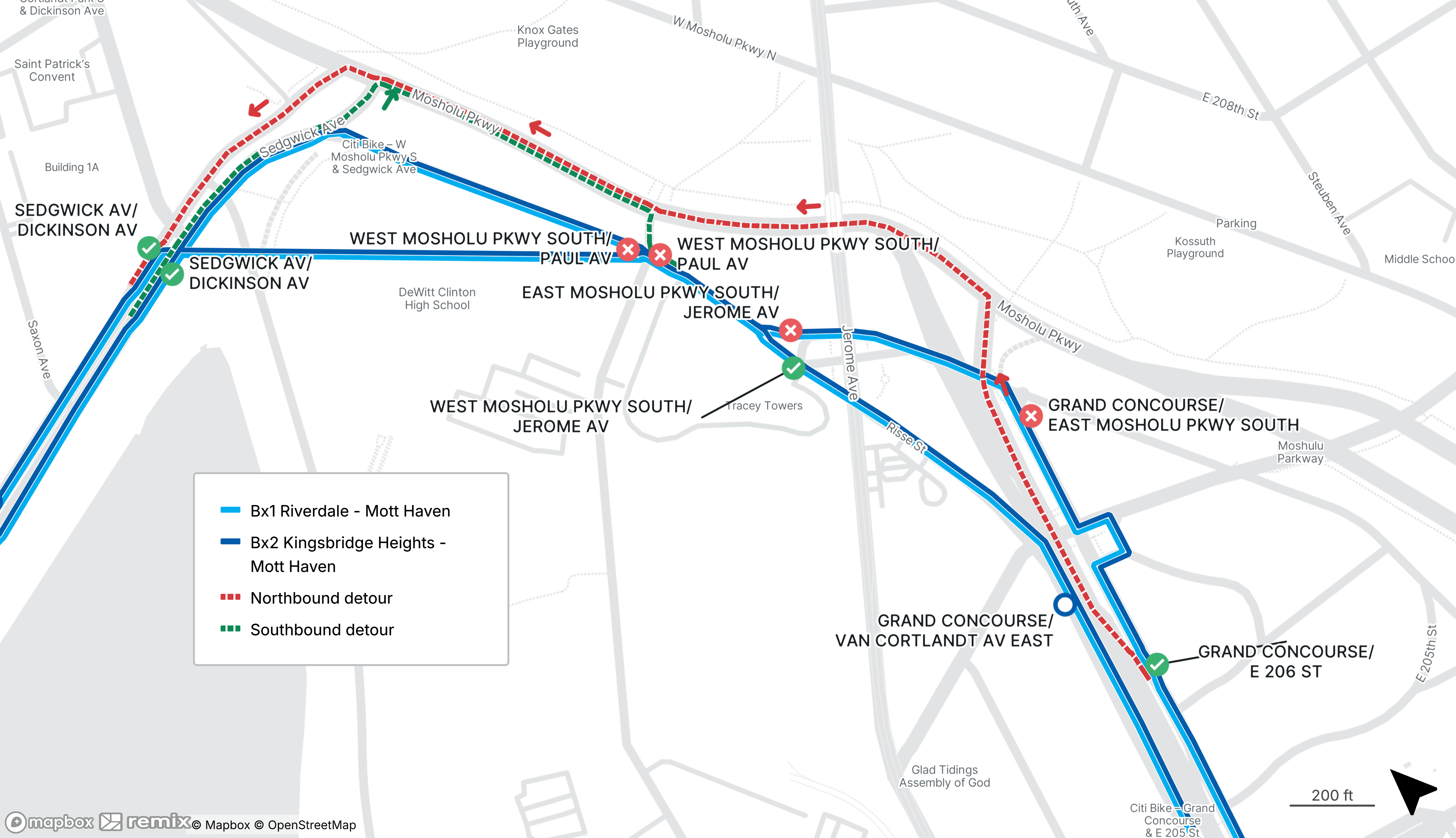 Bx1 and Bx2 buses will be detoured between Grand Concourse at Mosholu Parkway and Sedgwick Ave South at West Mosholu Parkway South