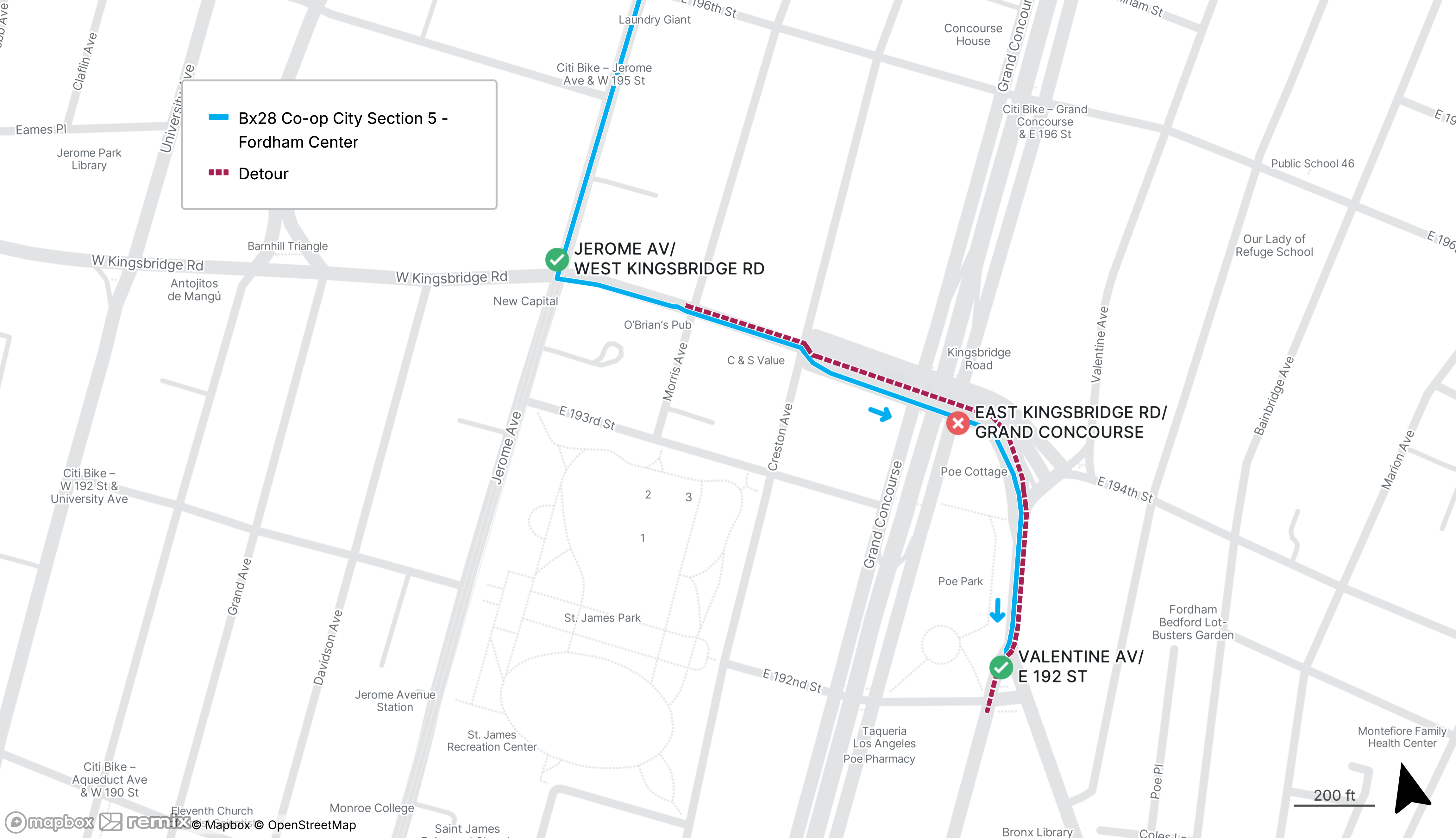 Eastbound Bx28 stop on East Kingsbridge Rd at Grand Concourse will be closed, buses will use the underpass