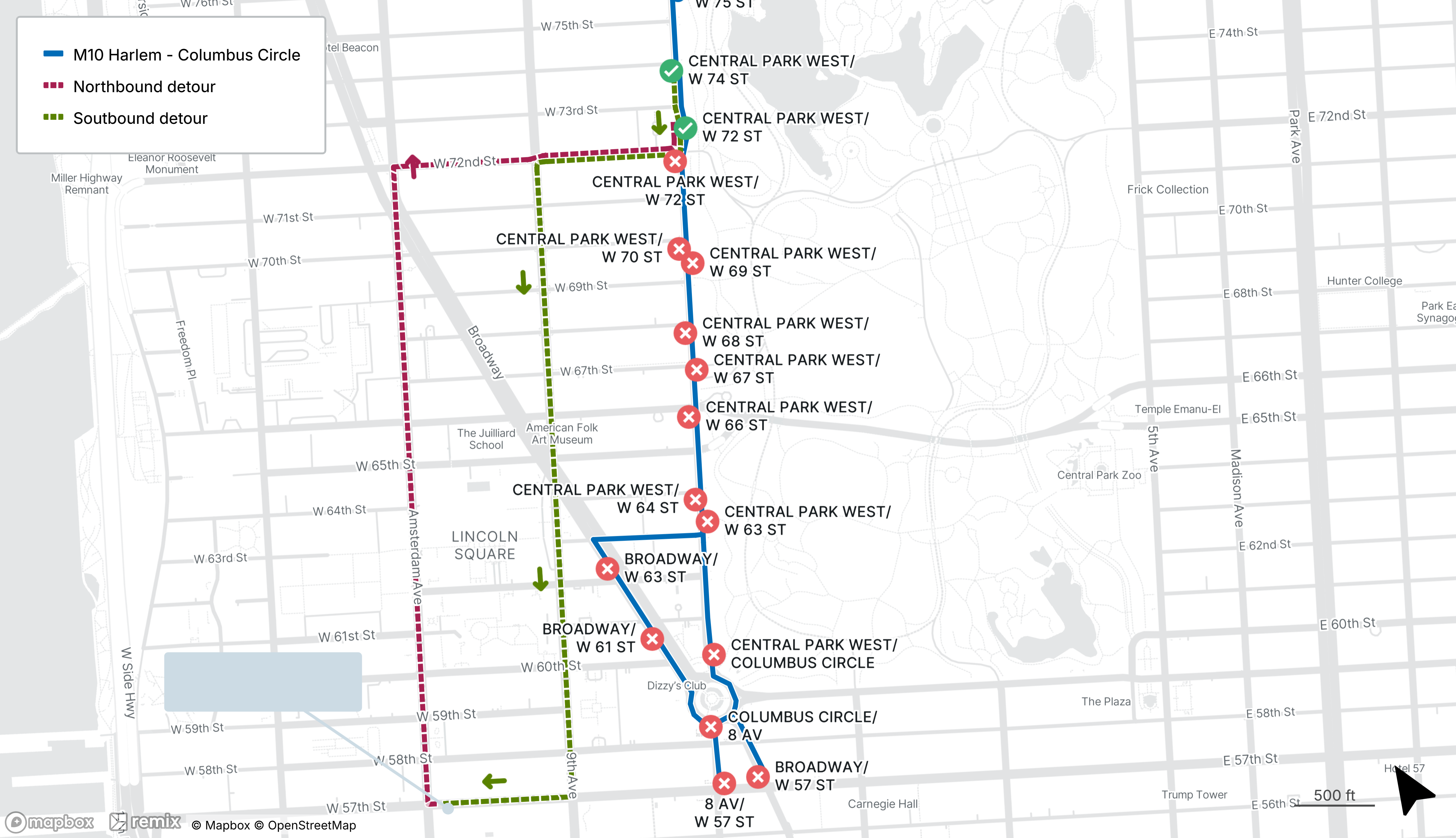 M10 buses will be detoured between W 57th St at Amsterdam Ave and Central Park West at W 72nd St
