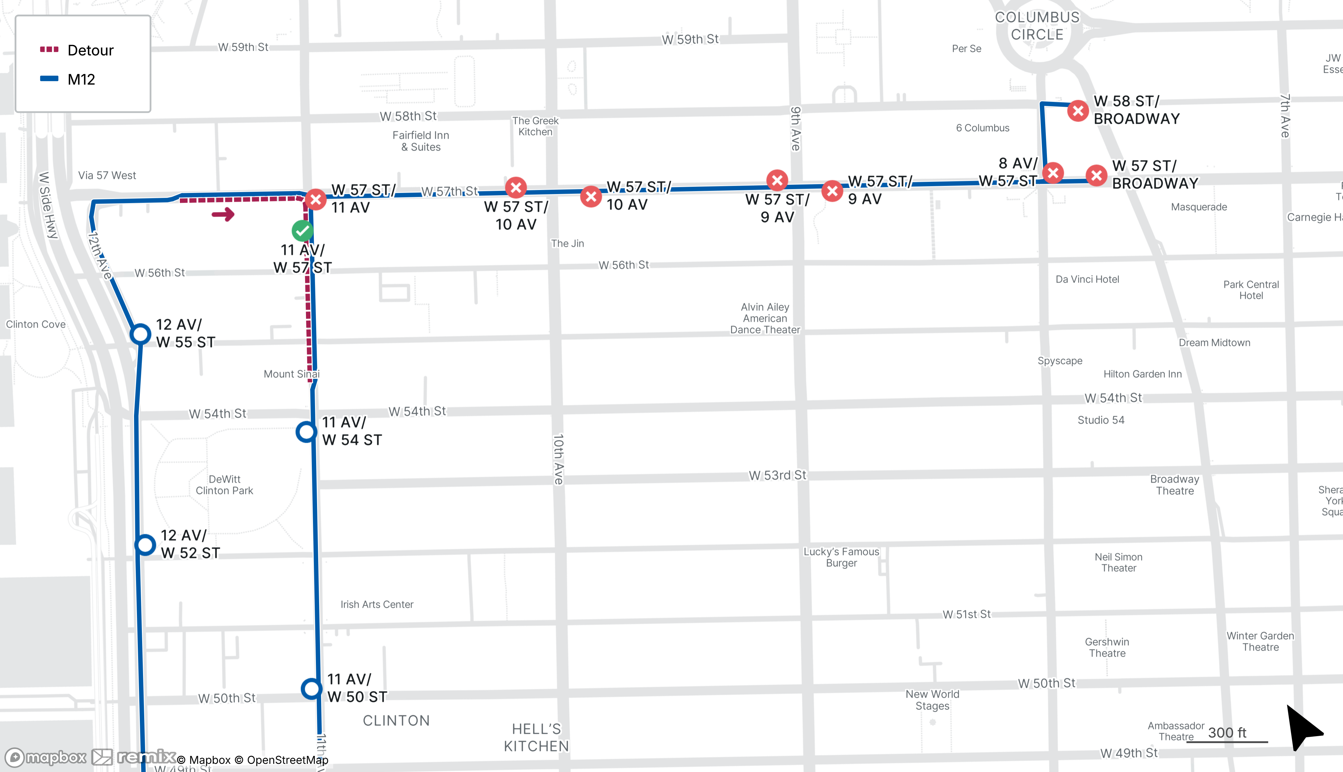 No M12 service between W 57th St at 11th Ave to W 58th St at Broadway