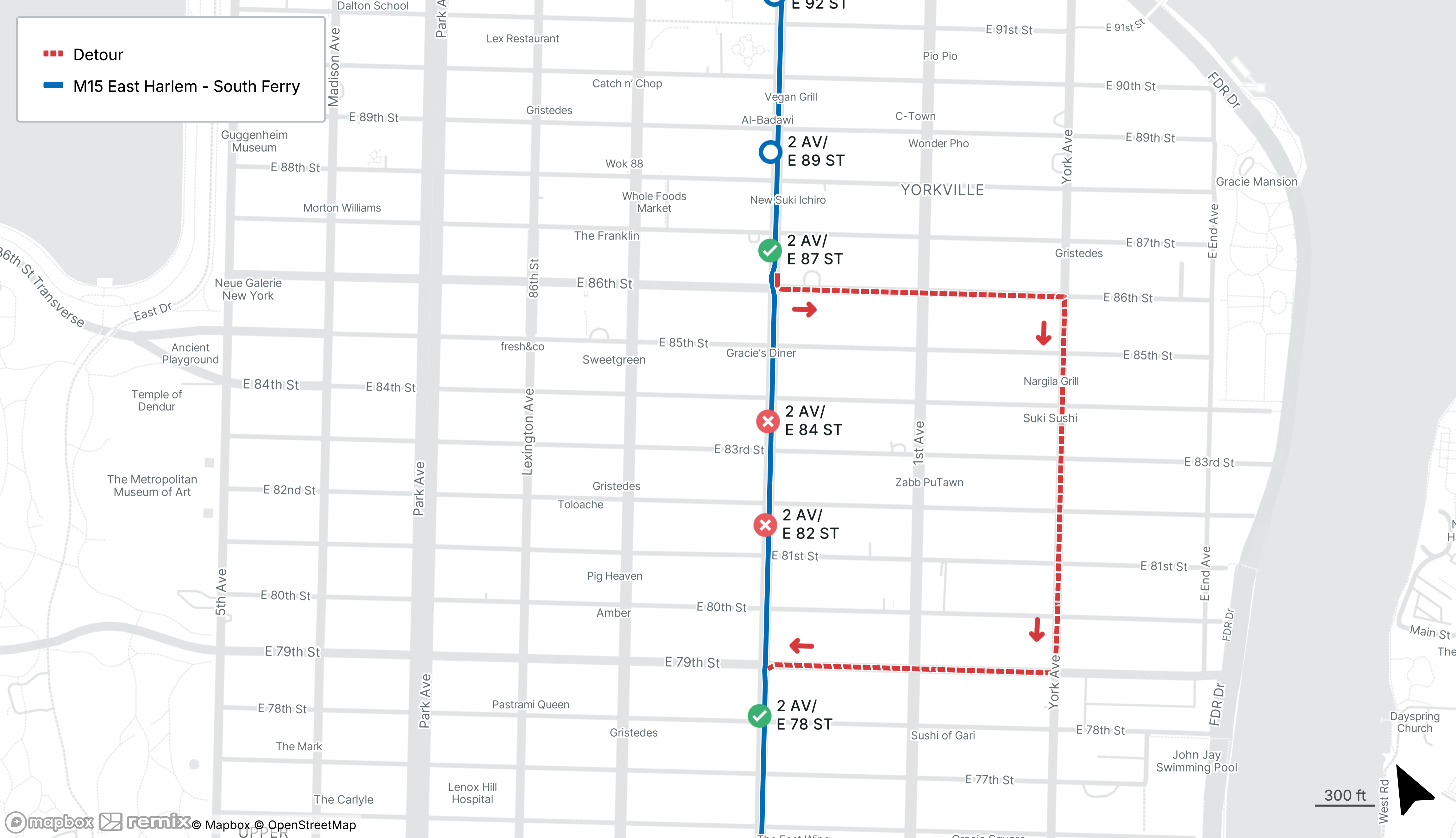 Southbound M15 stops on 2nd Ave at E 84th St and E 82nd St will be closed