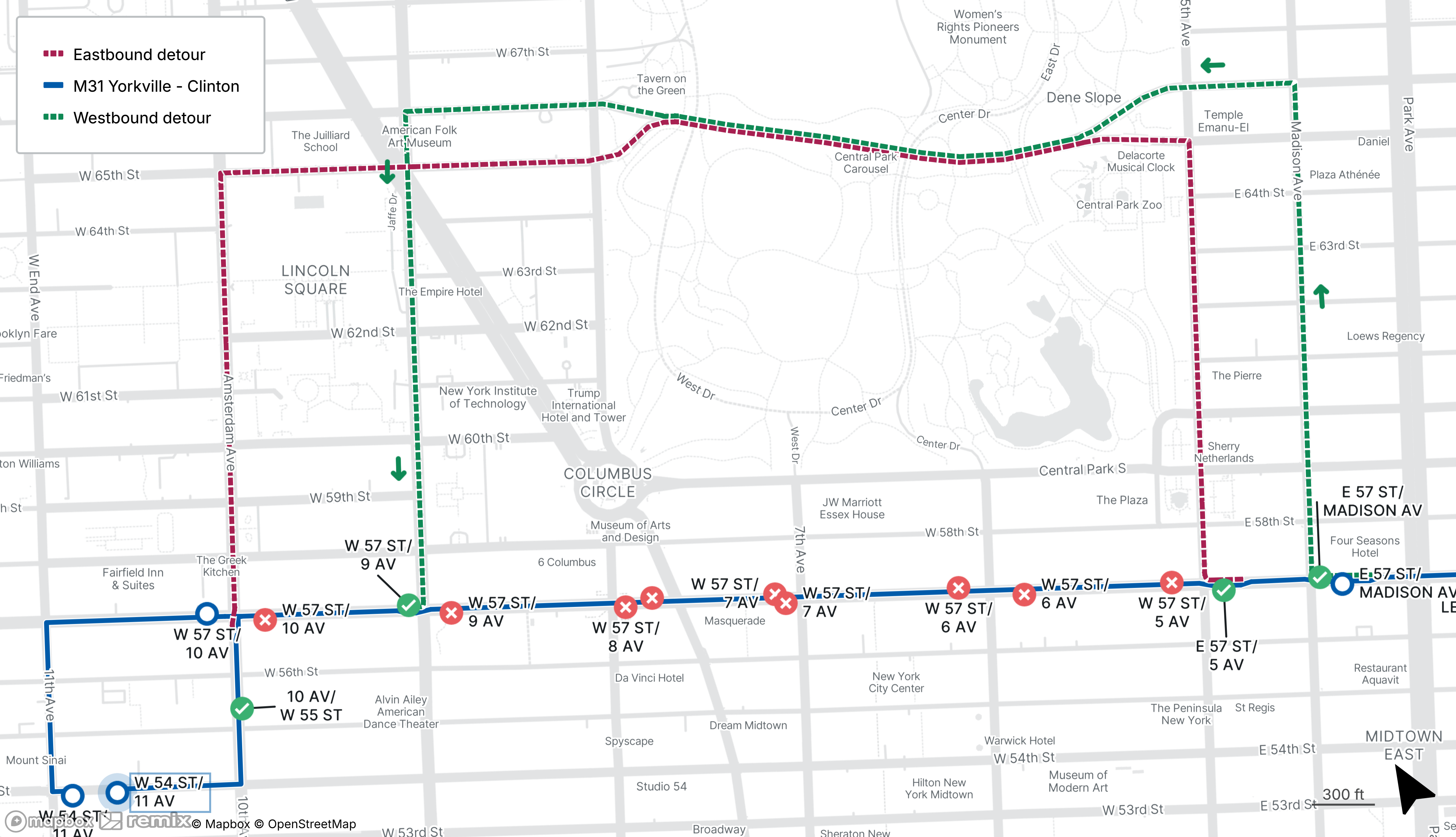 M31 buses will be detoured between 10th Ave from W 57th St and E 57th St at Madison Ave