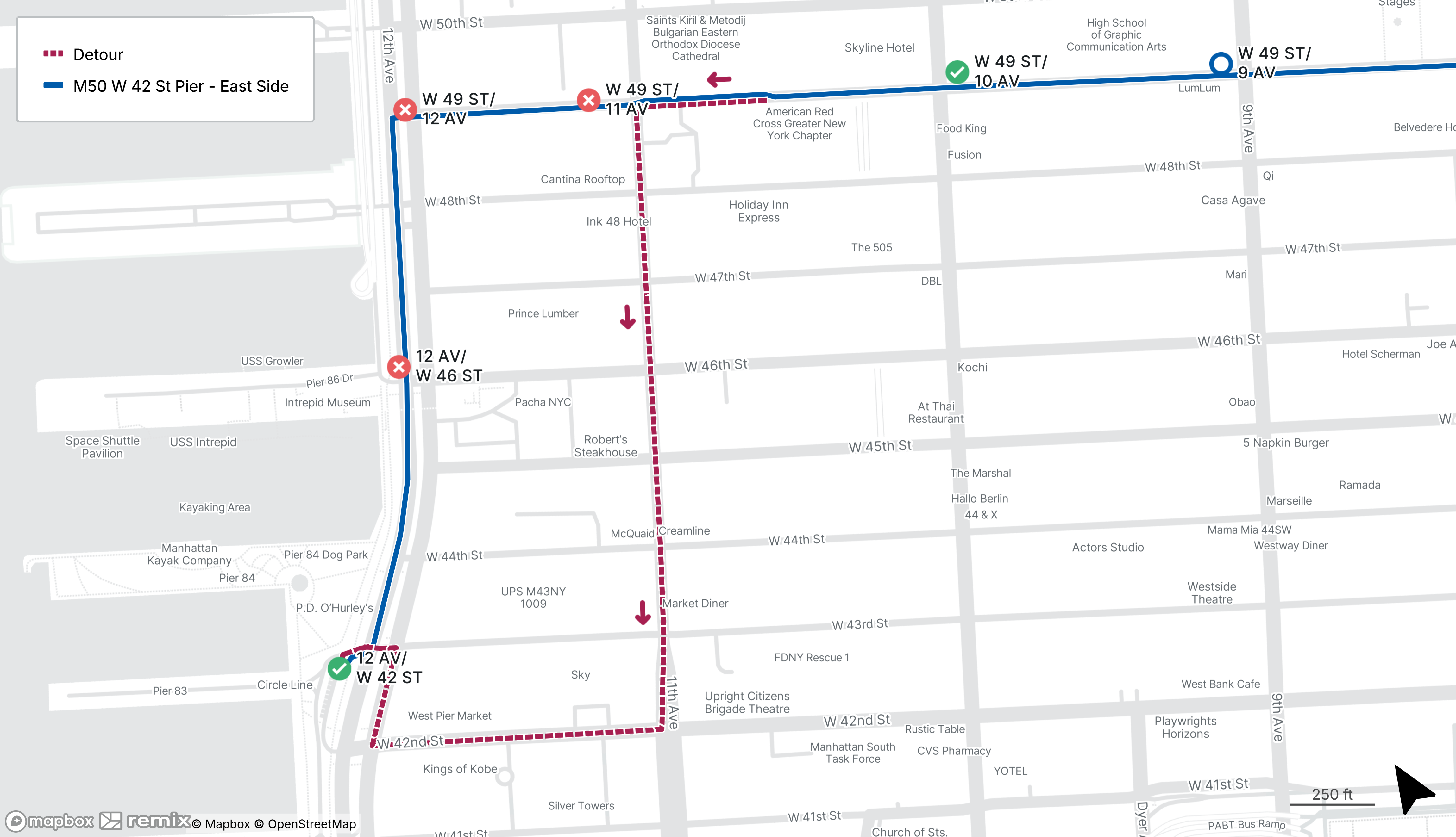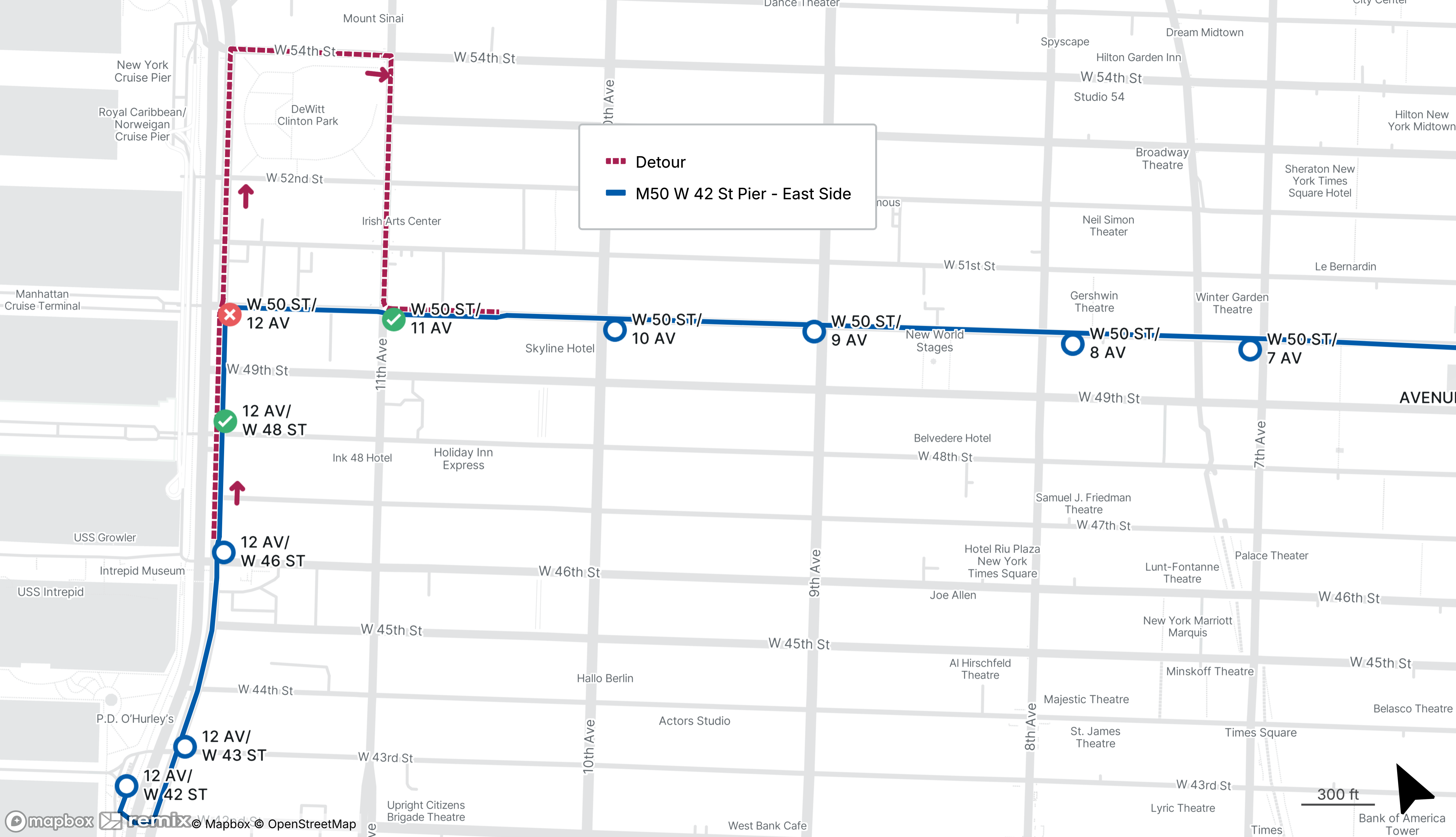 Westbound M50 stops on W 49th St at 11th Ave and 12th Ave and on 12th Ave at W 46th St will be closed