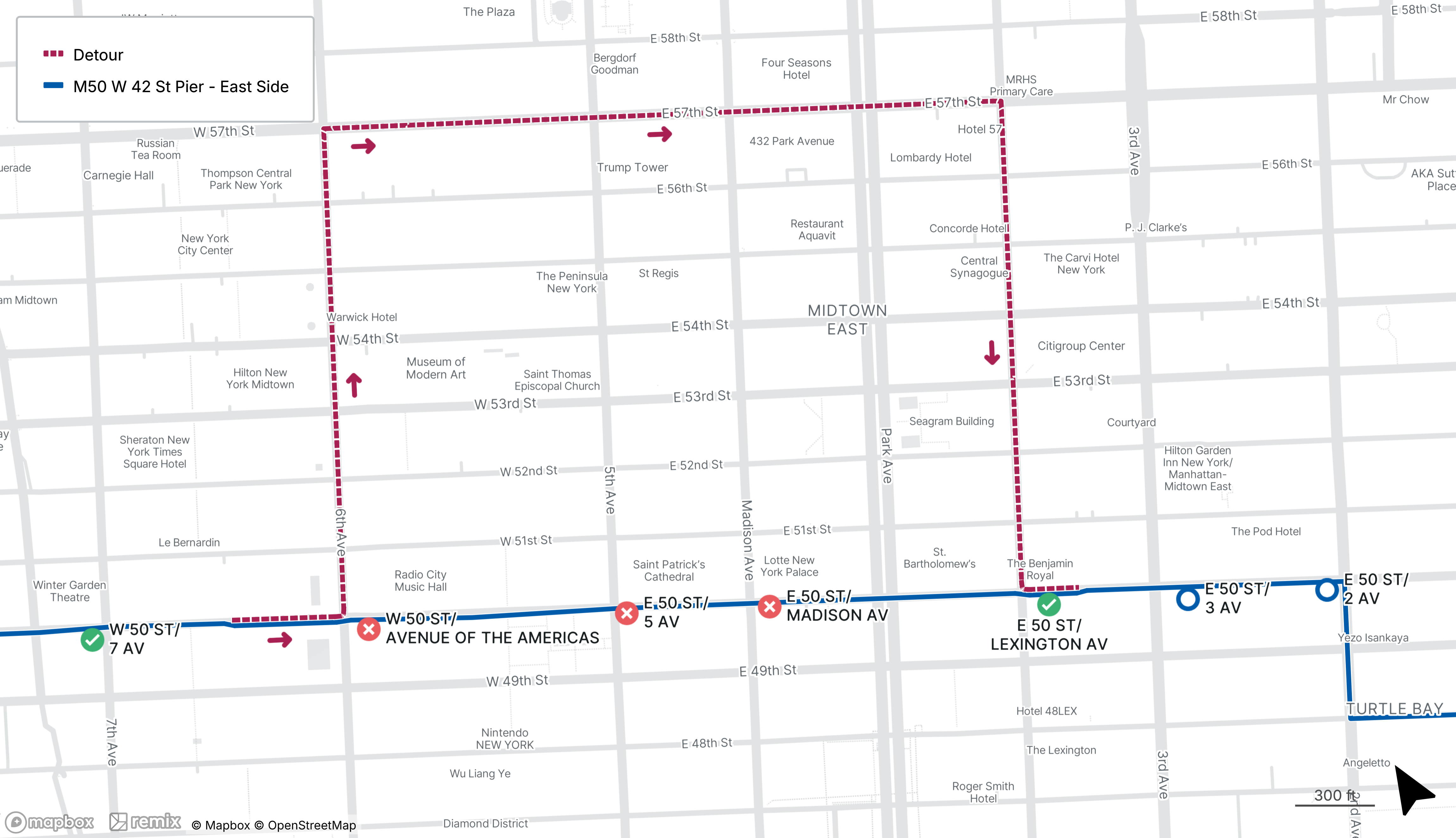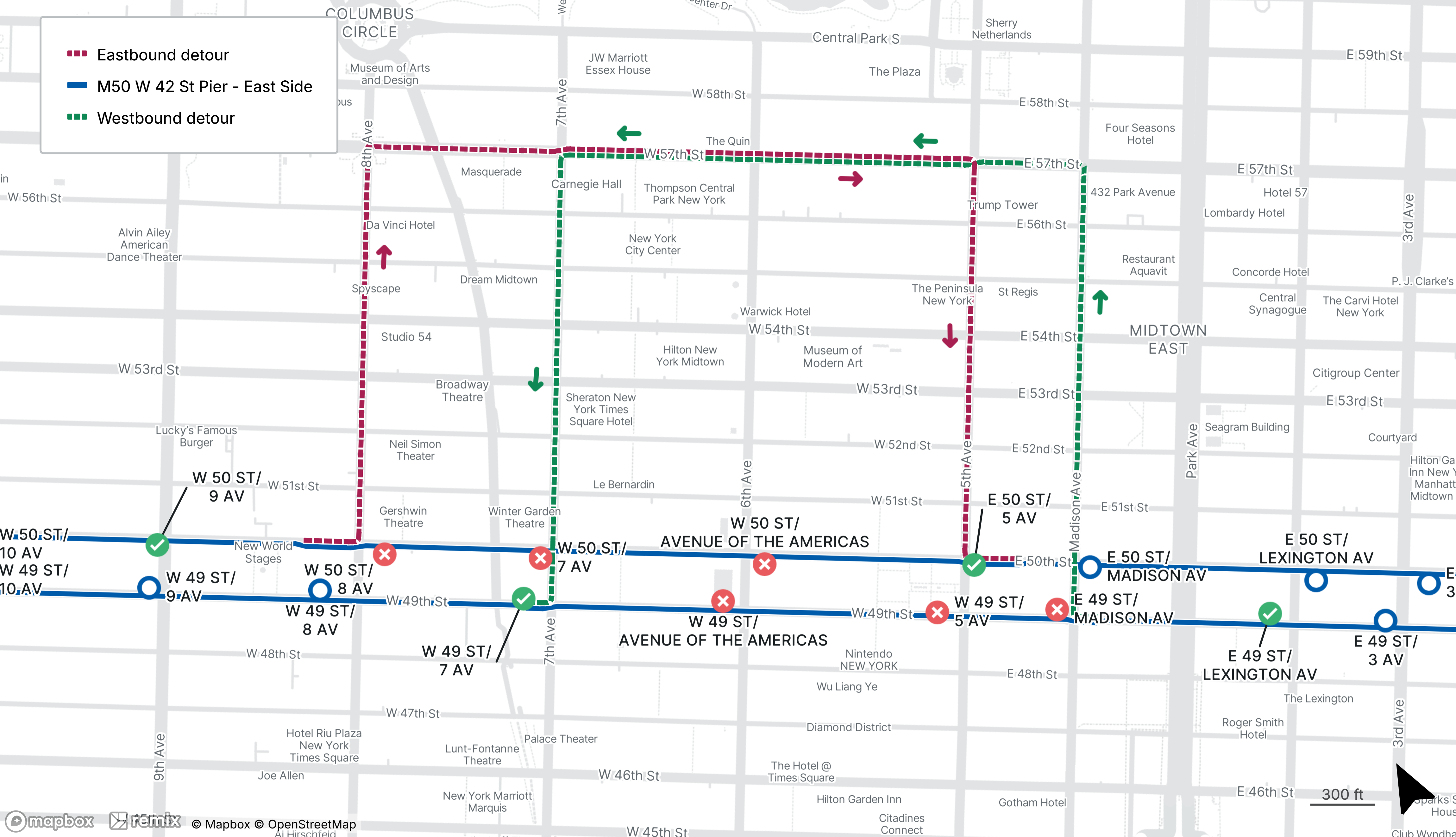 M50 buses will be detoured between 50th St at 8th Ave and 49th St at Madison Ave