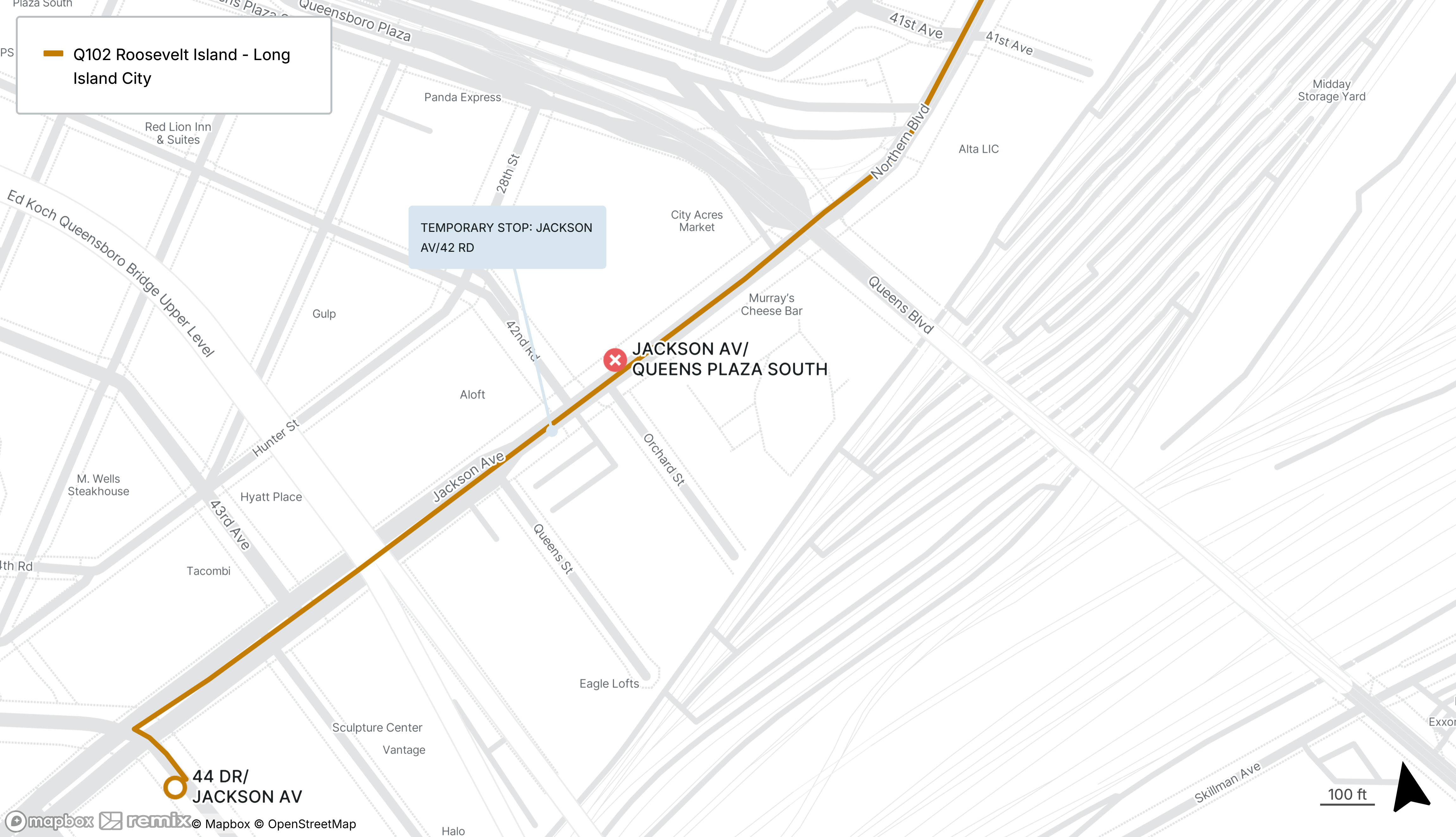 Southbound Q102 stop on Jackson Ave at Queens Plaza South will be closed, use the temporary stop on Jackson Ave at 42nd Rd, far side