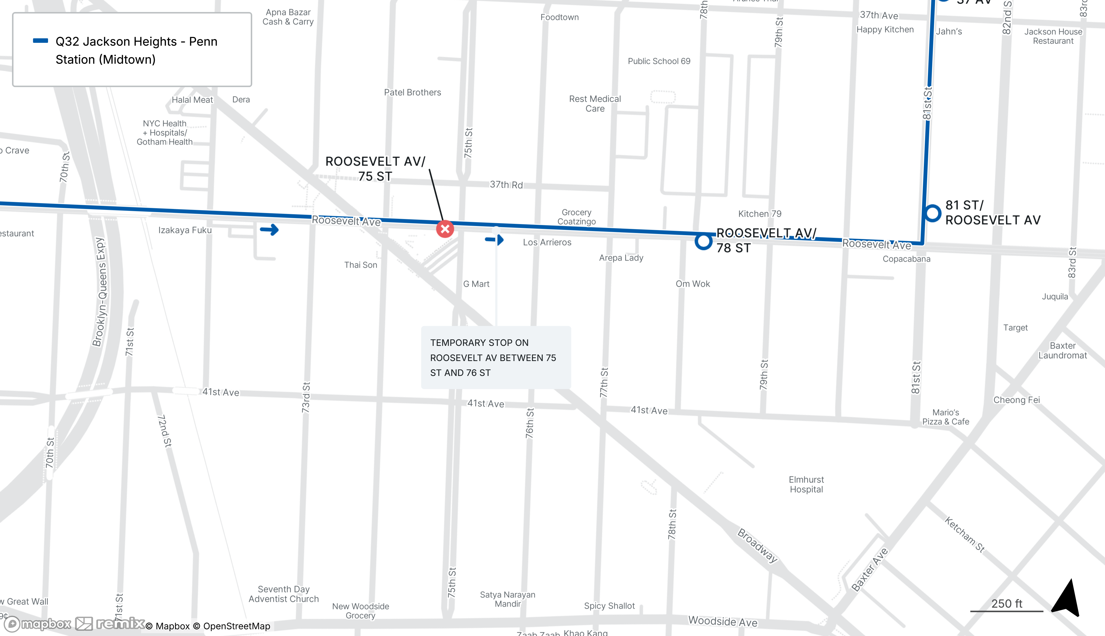 Eastbound Q32 stop on Roosevelt Ave at 75th St will be closed, use the temporary stop on Roosevelt Ave between 75th St and 76th St