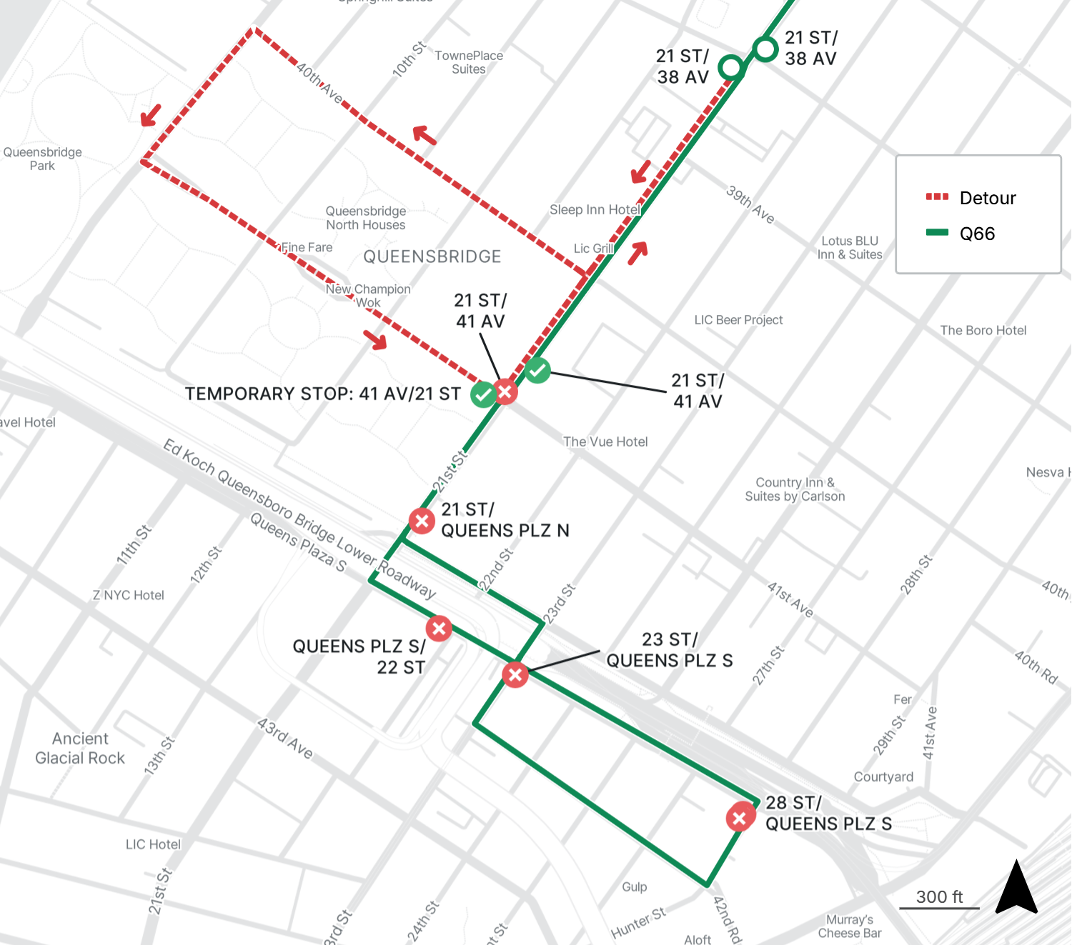 No Q66 service between 21st St at 41st Ave and 28th St at Queens Plaza South