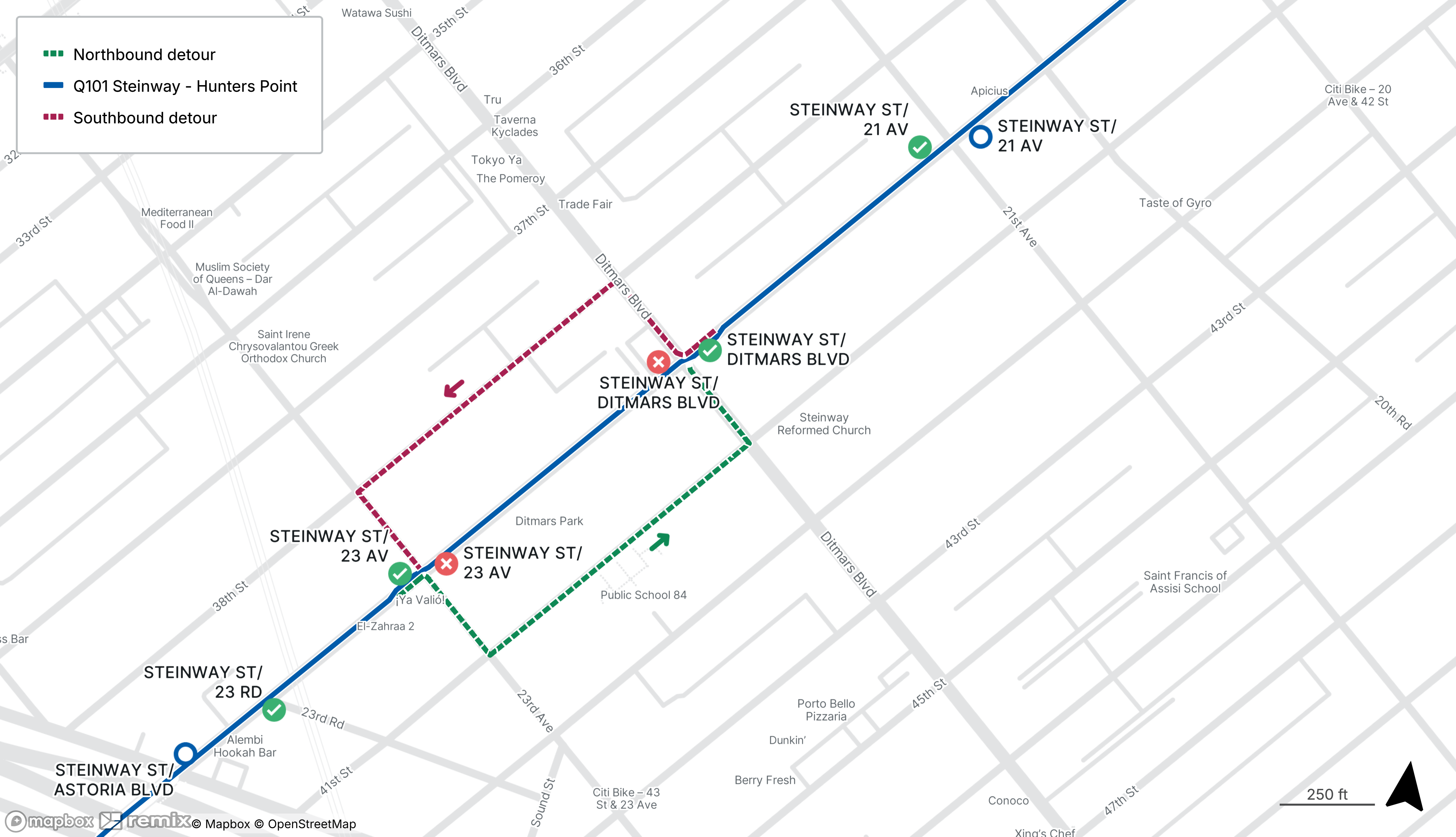 Q101 southbound stop on Steinway St at Ditmars Blvd and northbound on Steinway St at 23rd Ave will be closed