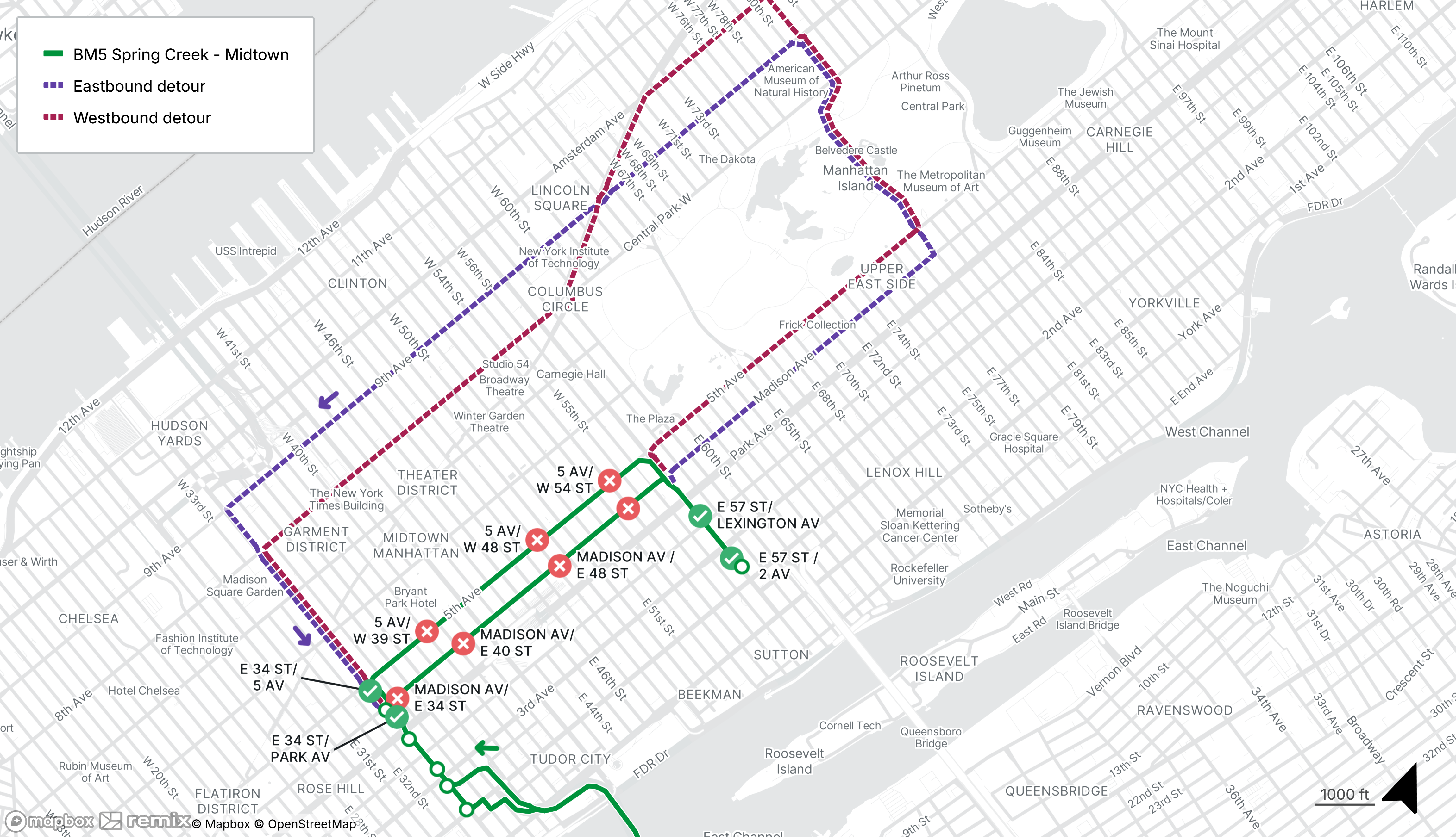 BM5 buses will be detoured between 57th St at Madison Ave and 34th St at 8th Ave