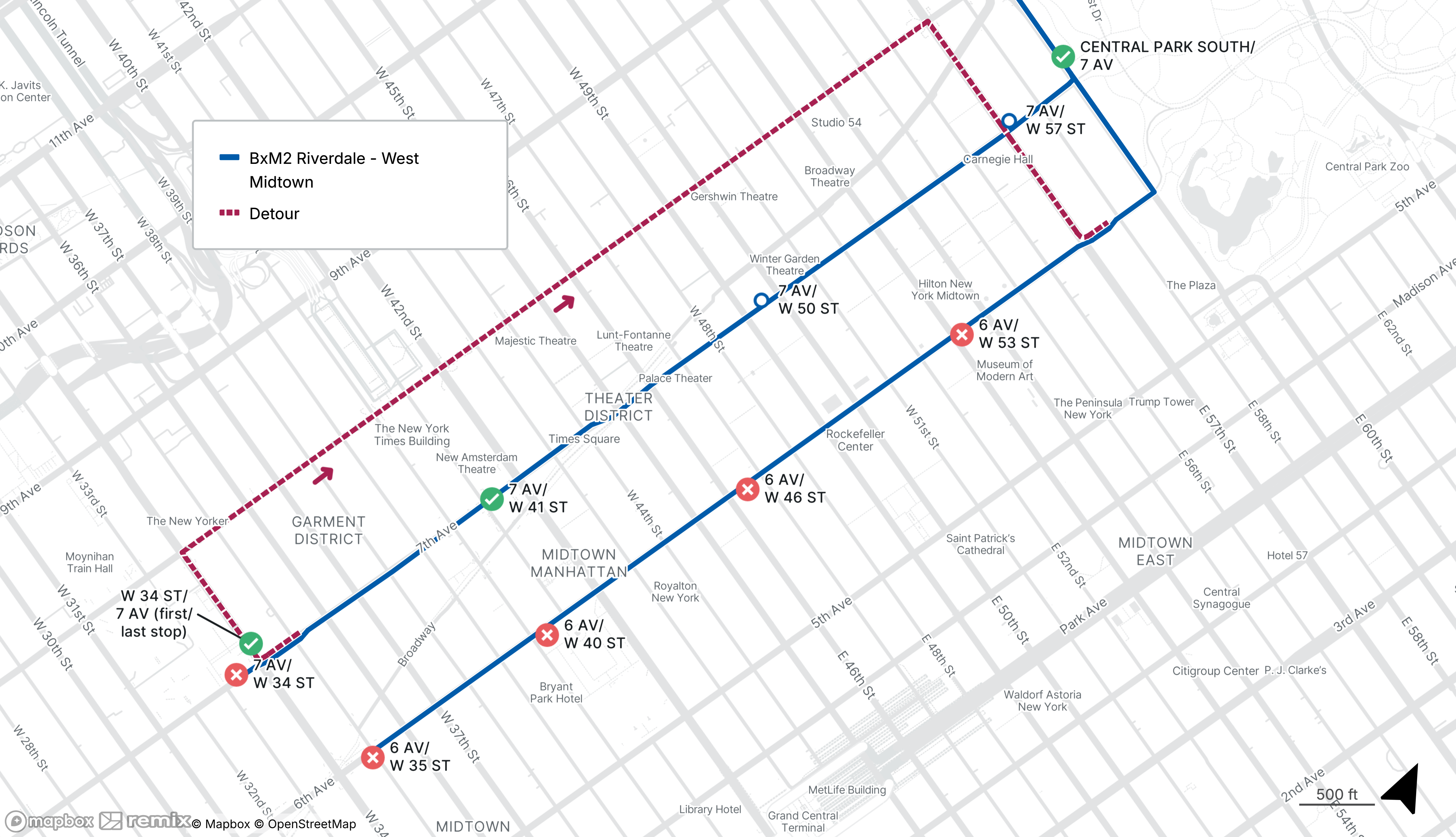 BxM2 southbound stop on 7th Ave at W 34th St and all northbound stops on 6th Ave will be closed