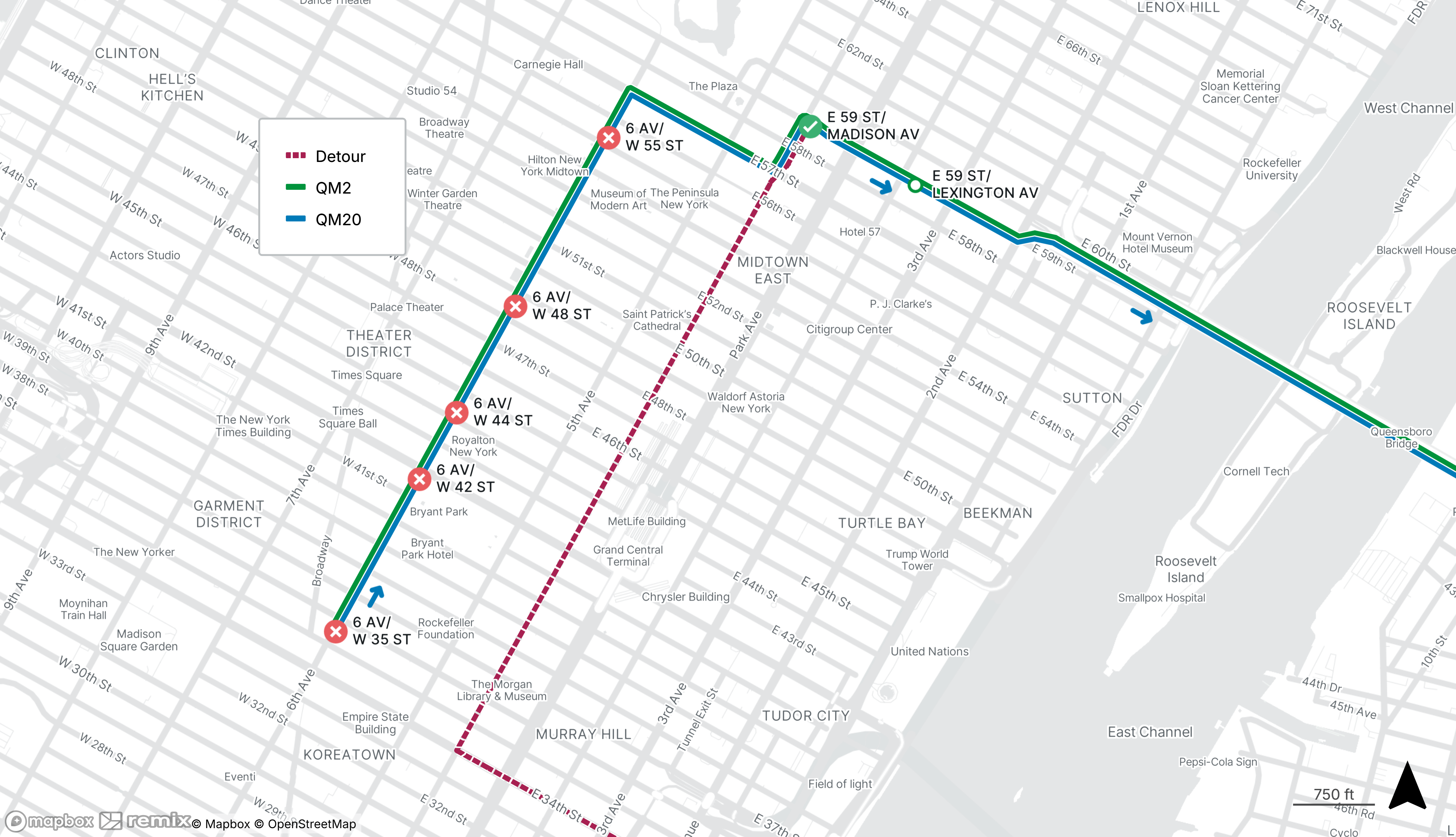 Eastbound QM2 and QM20 all stops on 6th Ave from 35th St to 55th St will be closed