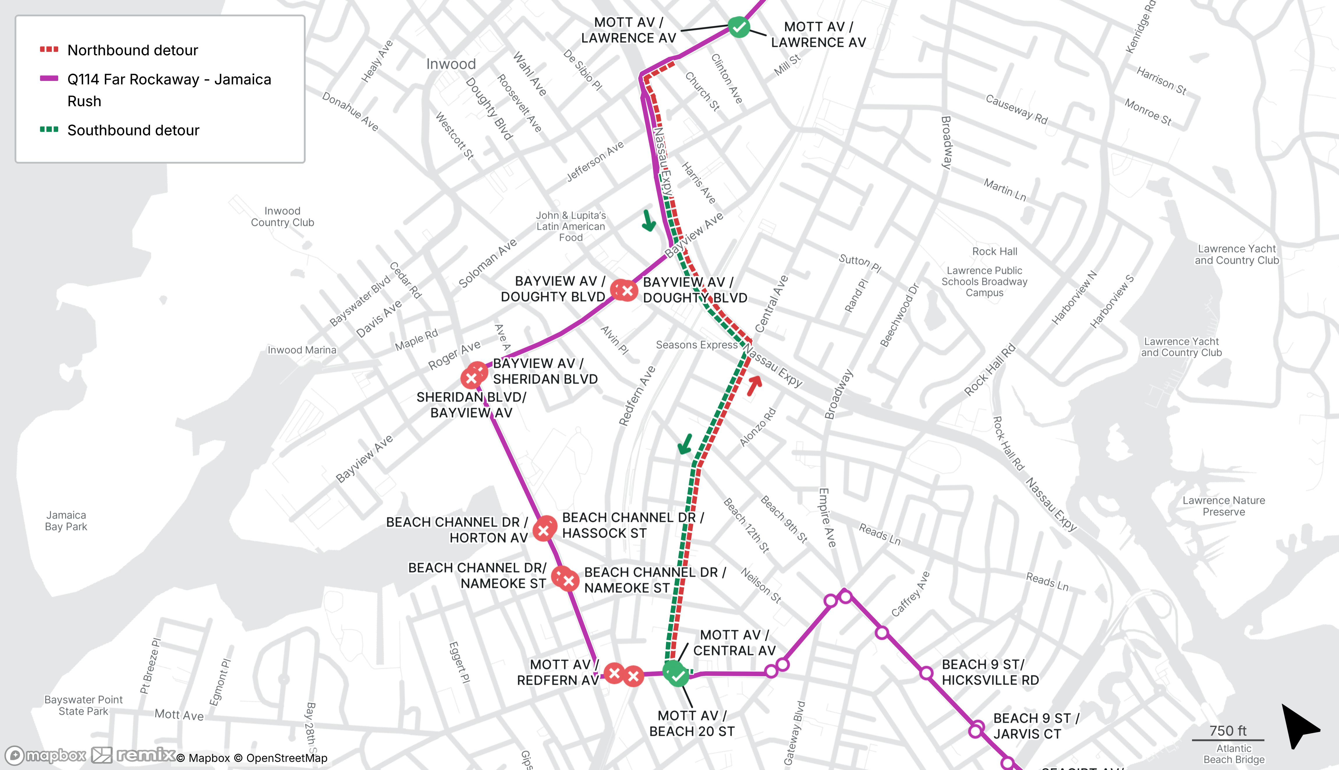 Q114 buses will be detoured between Mott Ave at Central Ave and Nassau Expressway at Bayview Ave