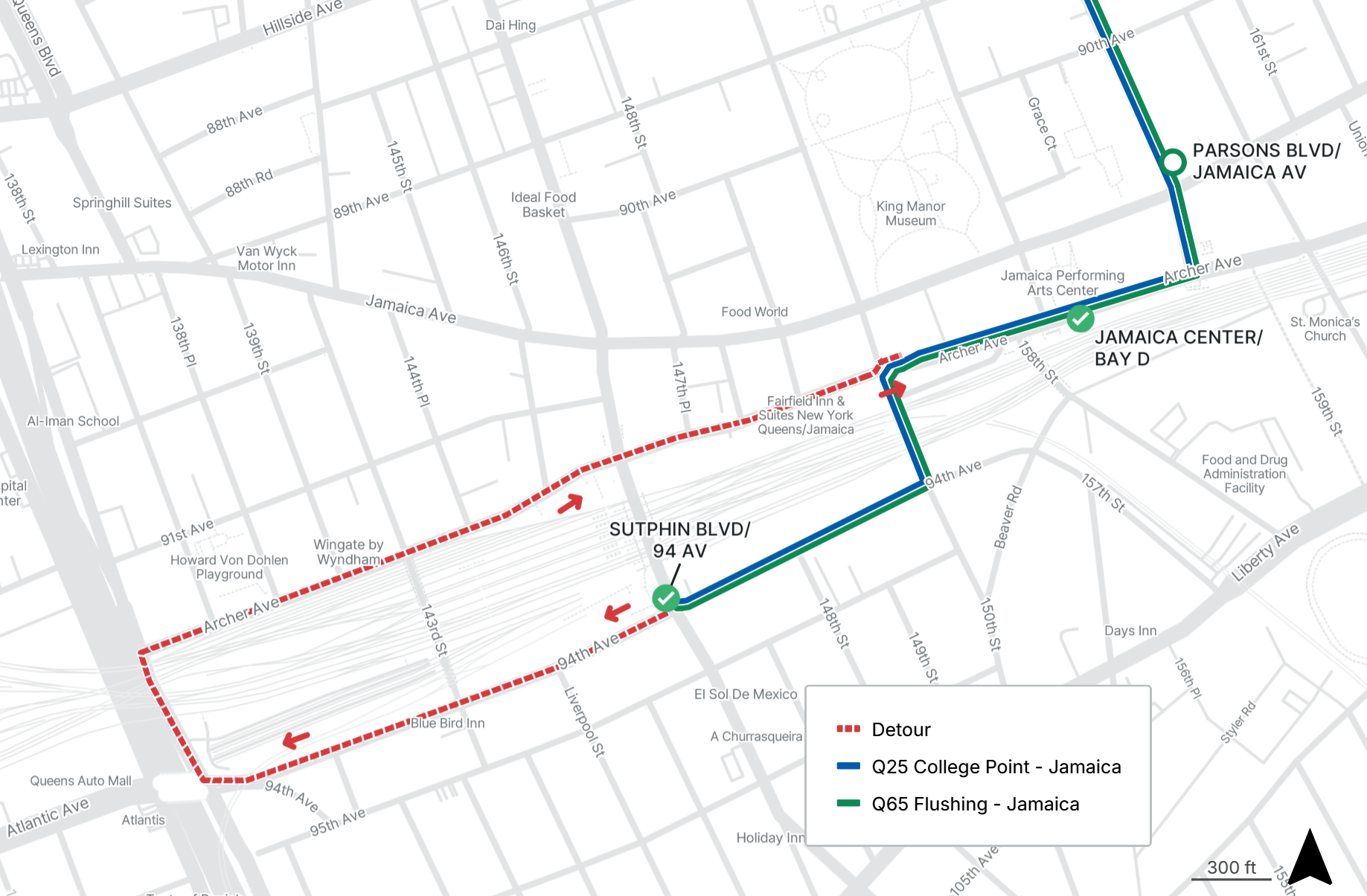 Northbound Q25 and Q65 buses are detoured from Sutphin Blvd at 94th Ave to 150th St at Archer Ave - no stops are missed