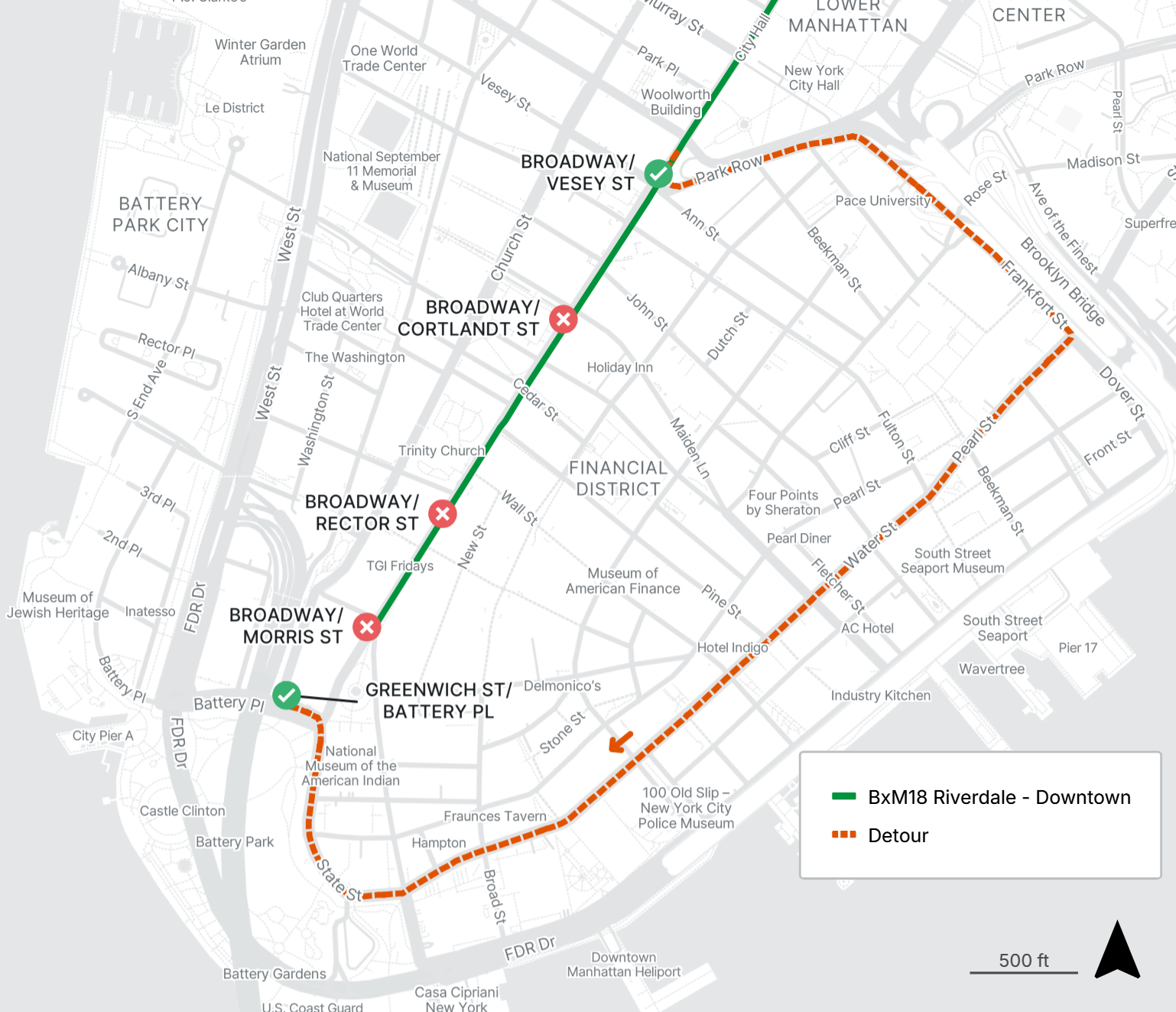 Southbound BxM18 stops along Broadway from Cortlandt St to Morris St are closed