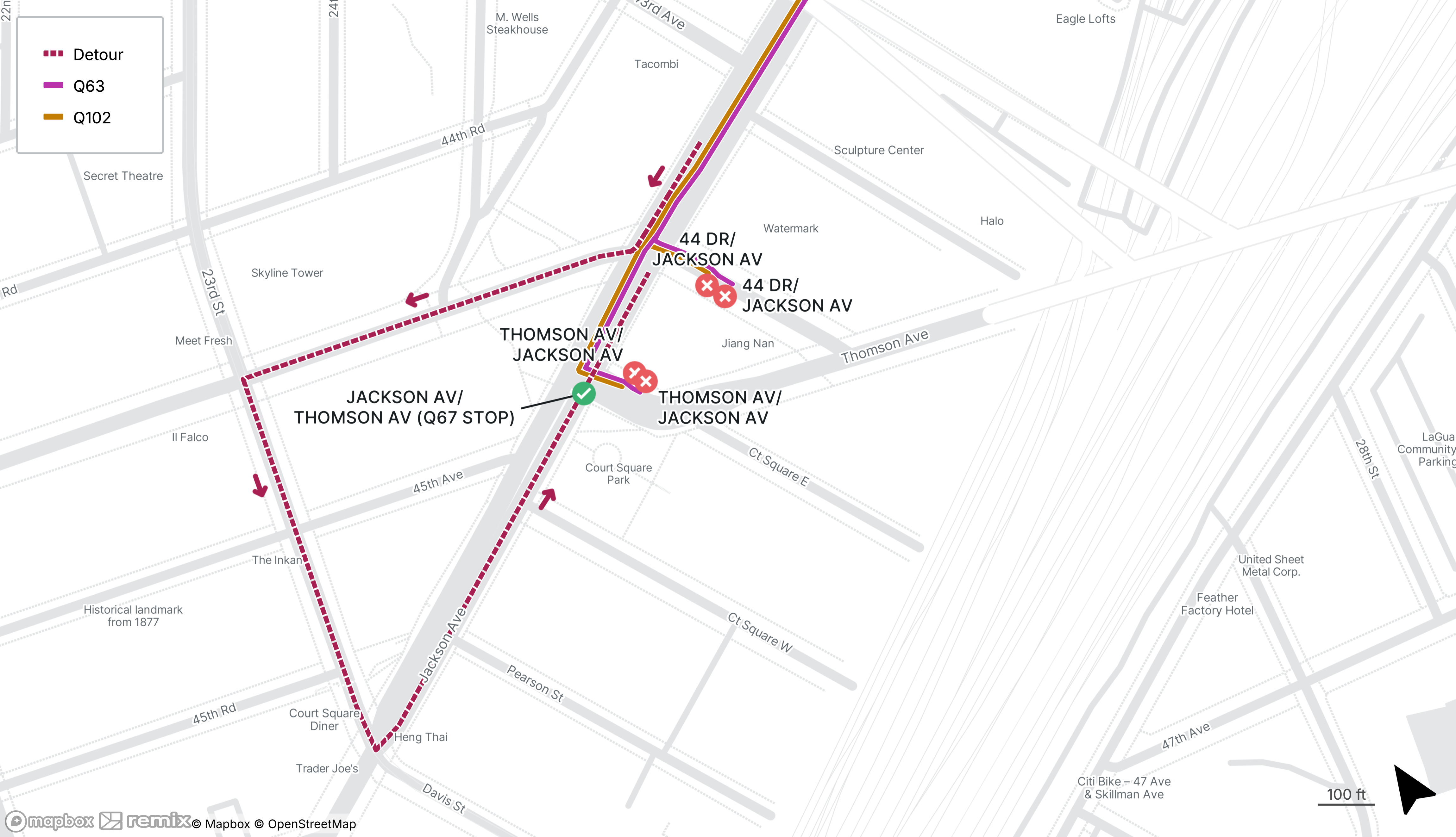 No Q102 and Q63 service on 44th Drive at Jackson Ave and Thomson Ave at Jackson Ave
