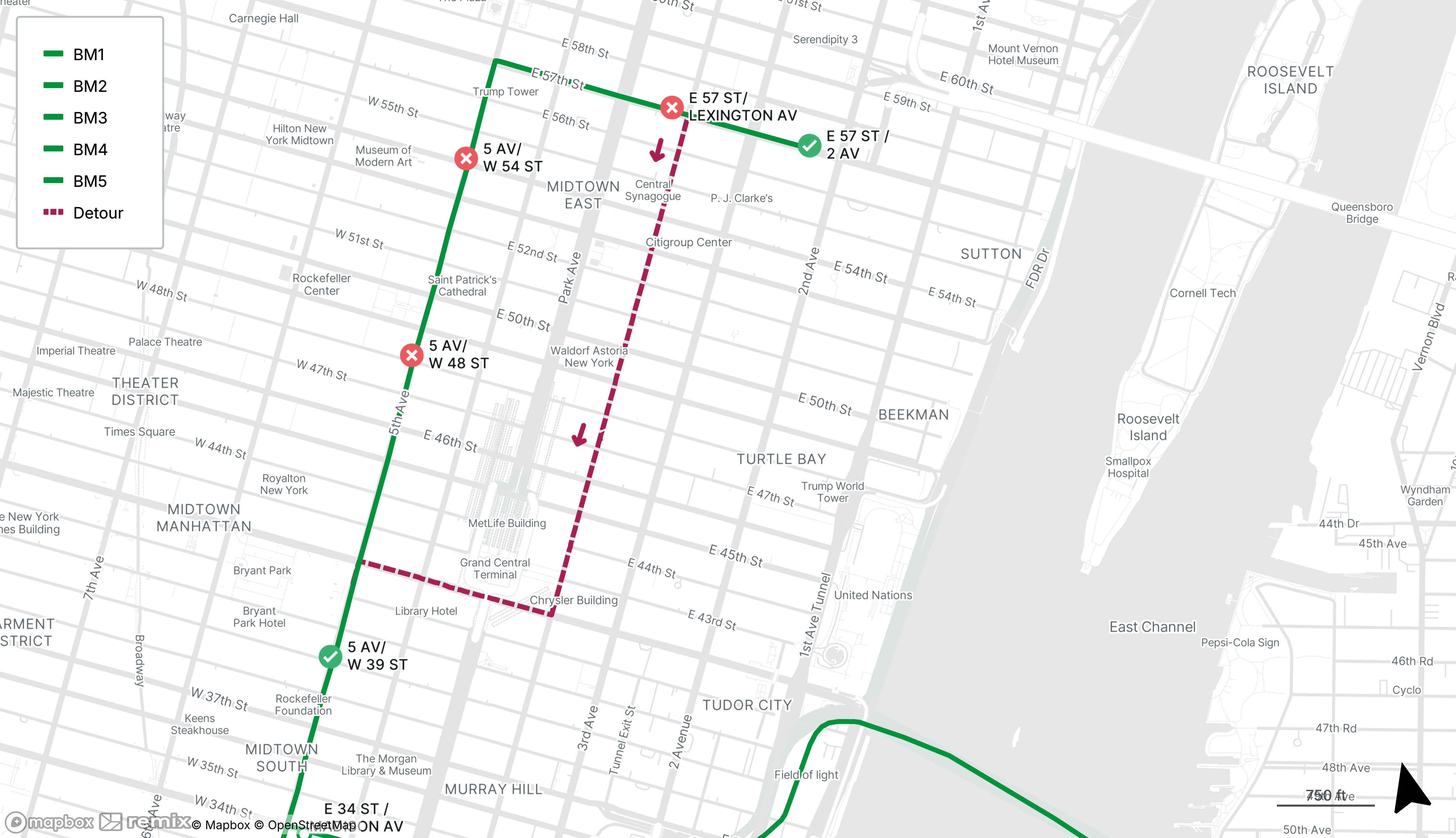 Southbound BM1, BM2, BM3, BM4 and BM5 stops on E 57th St at Lexington Ave and 5th Ave at W 54th St and W 48th St will be closed