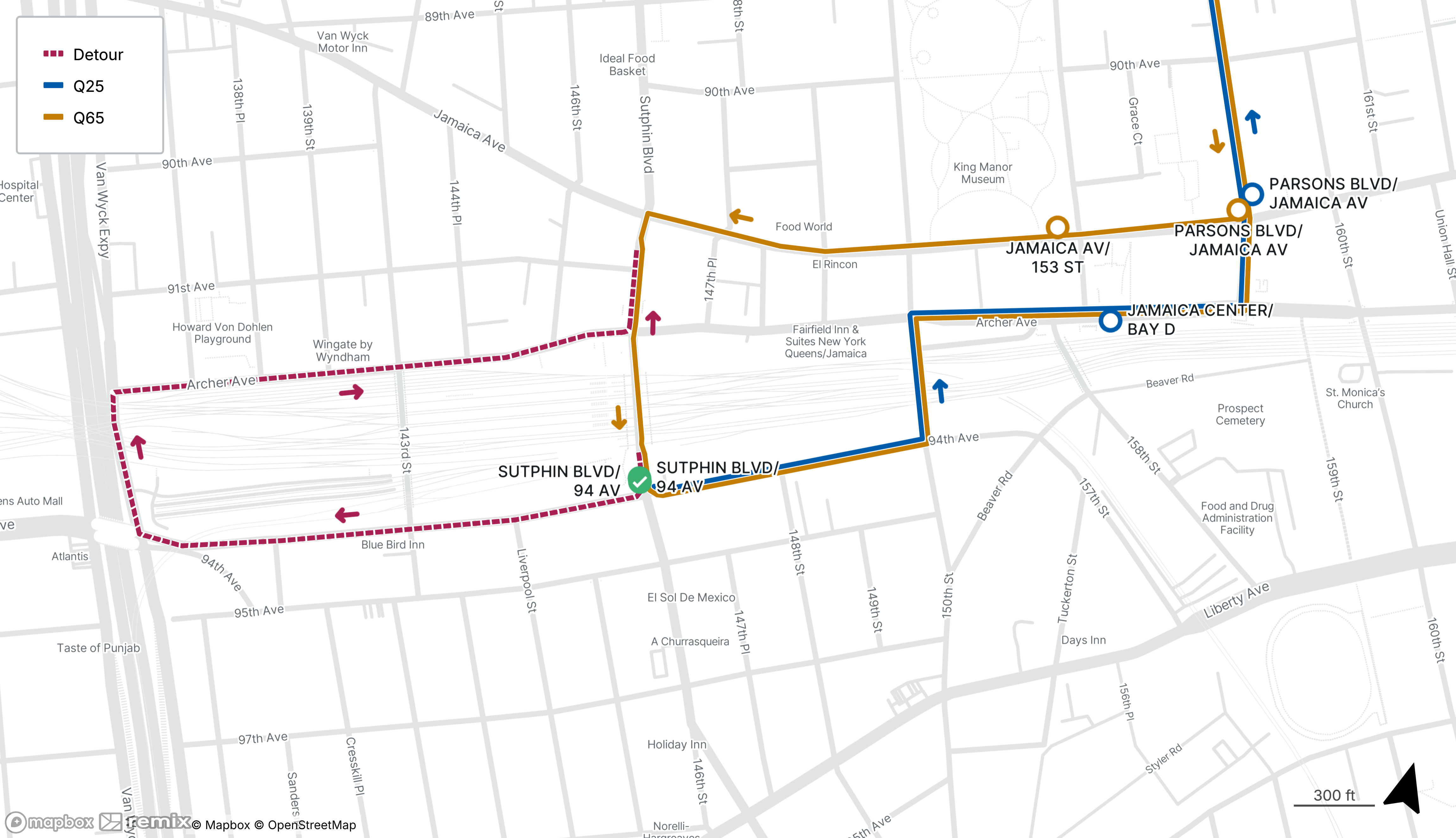 Northbound Q25 and Q65 buses will be detoured from Sutphin Blvd at 94th Ave to 150th St at Archer Ave - no stops will be missed